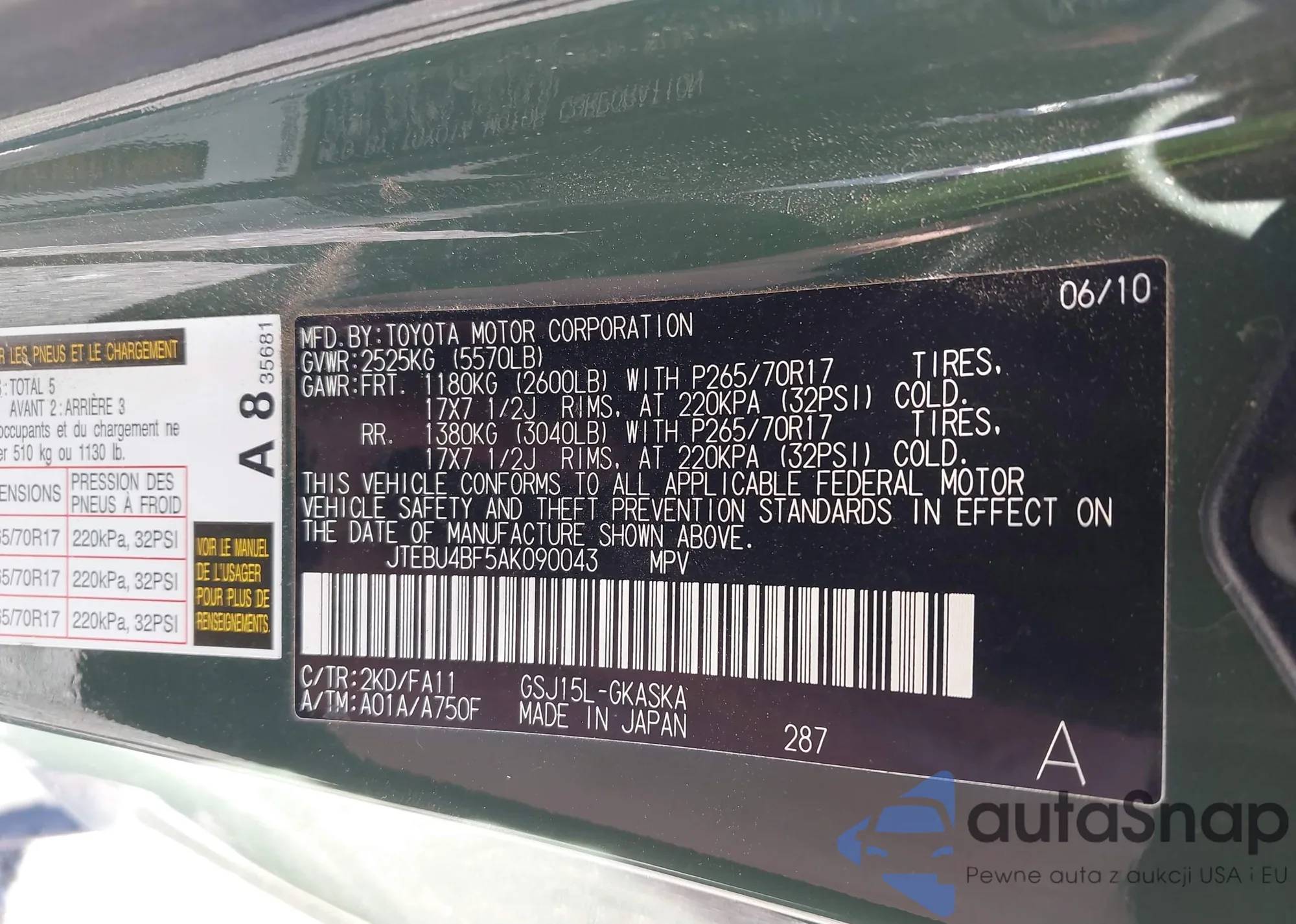 The car Toyota FJ Cruiser 2010 (VIN JTEBU4BF5AK090043) has not been auctioned before. The documents are clean, and the mileage matches or is below the market average. Sold by an insurance company – we recommend purchase. Delivery to the port will take approx. 6–8 weeks.