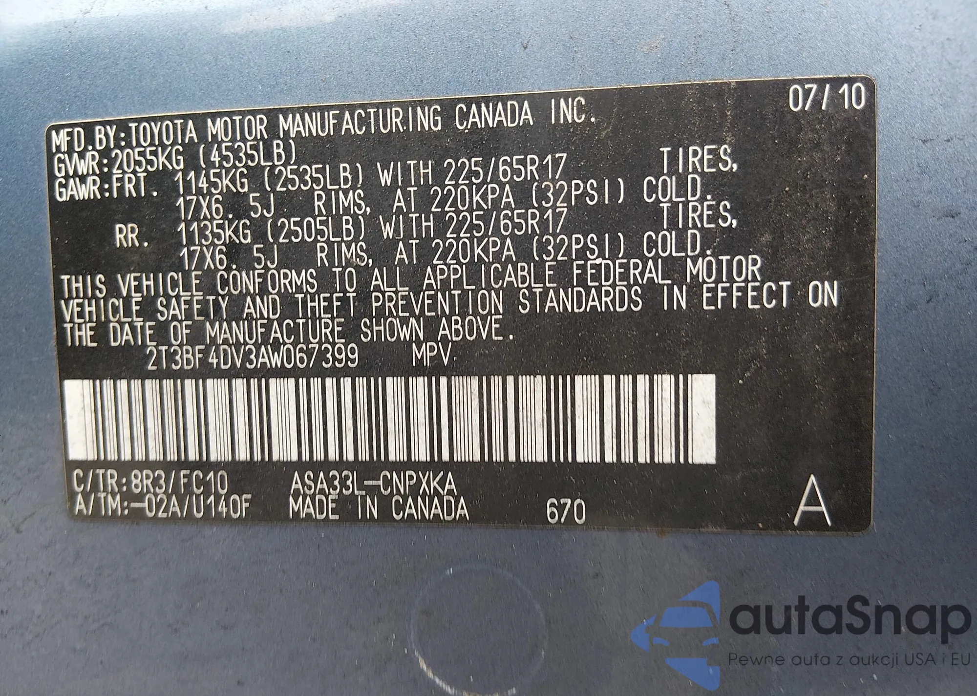 The car Toyota RAV 4 2010 (VIN 2T3BF4DV3AW067399) is sold by an unverified seller. We recommend checking the Carfax report and confirming registration possibilities before purchase.