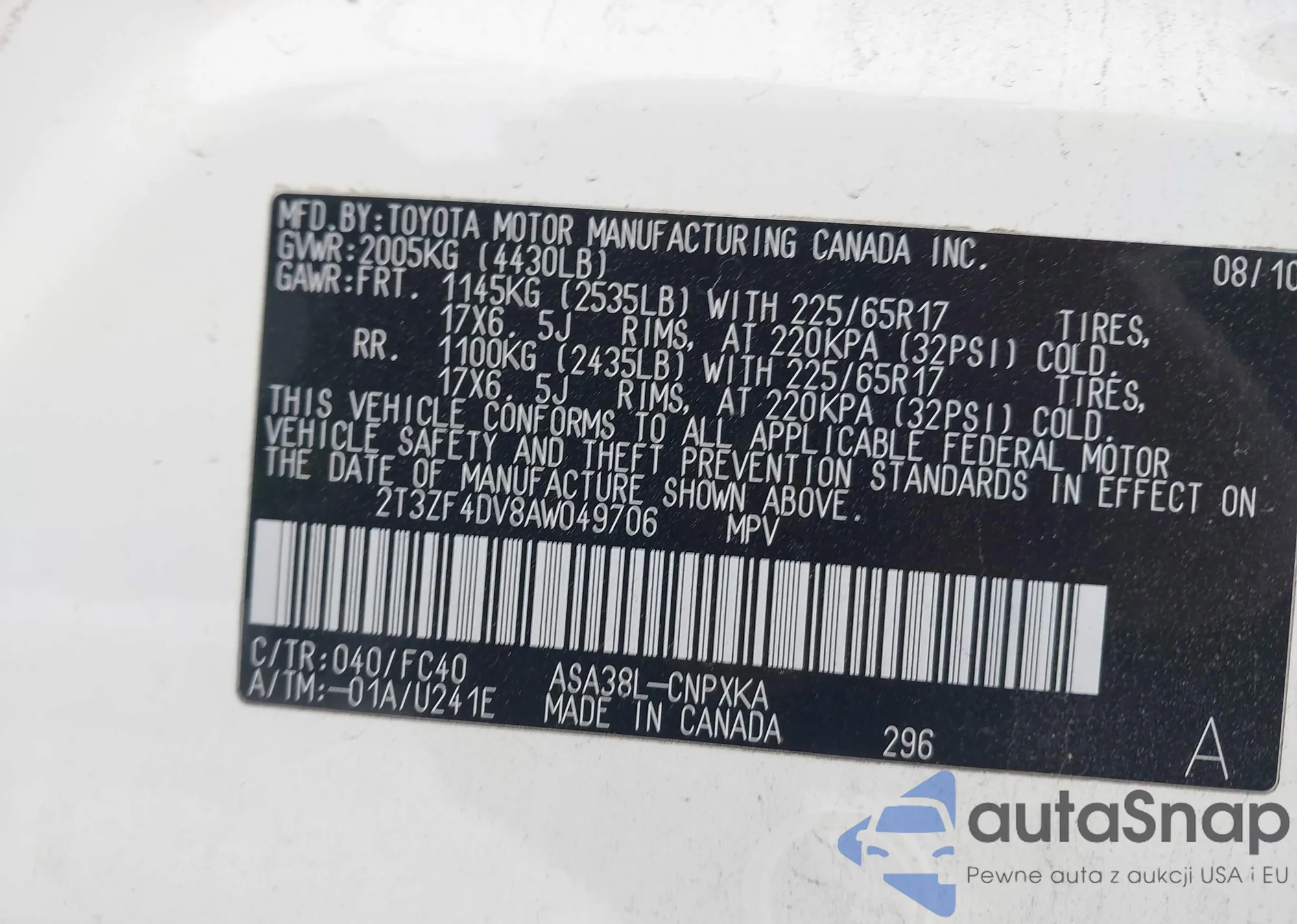 VIN: 2T3ZF4DV8AW049706