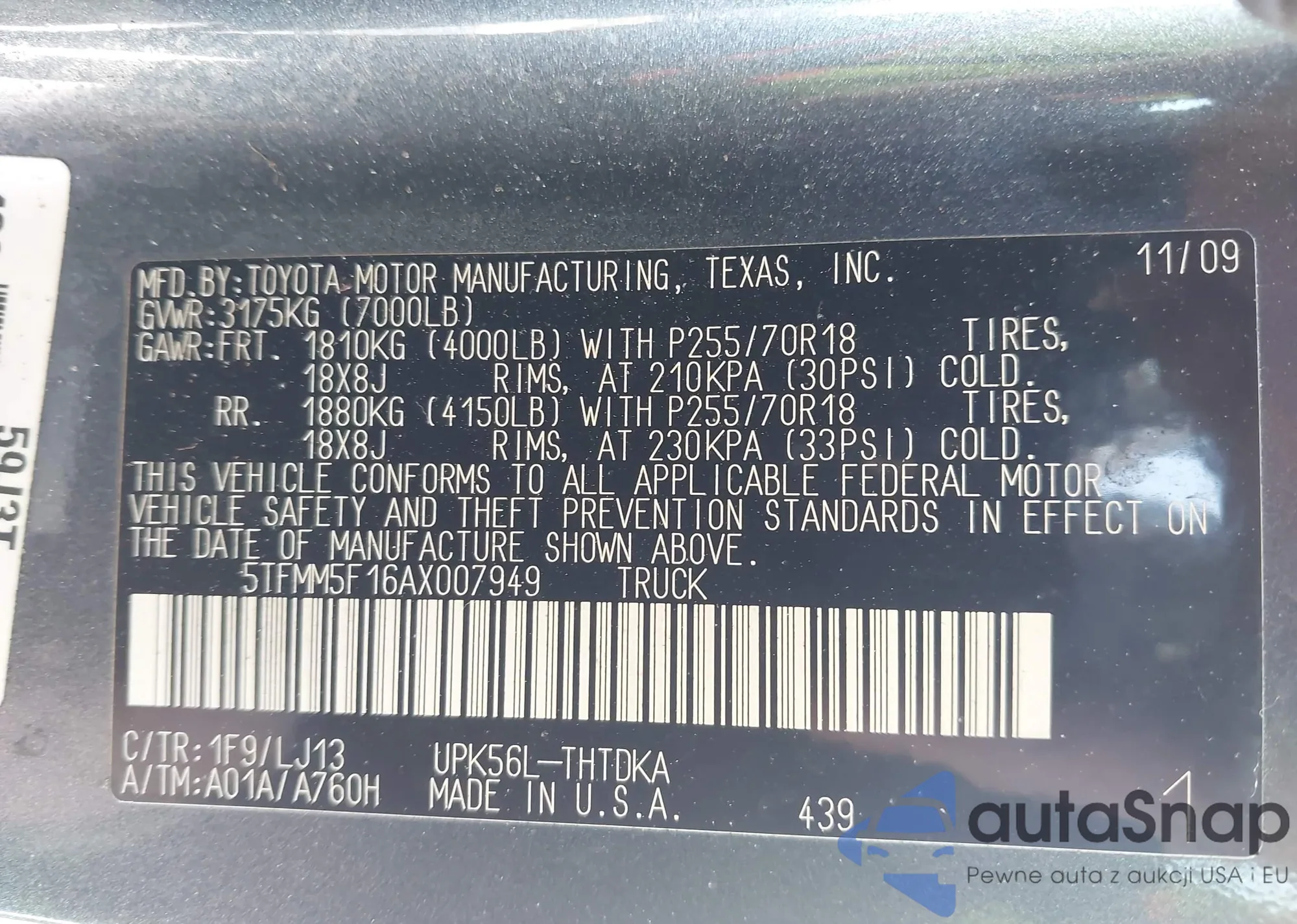The car Toyota Tundra 2010 (VIN 5TFMM5F16AX007949) has not been auctioned before. The documents are clean, and the mileage matches or is below the market average. Sold by an insurance company – we recommend purchase. Delivery to the port will take approx. 6–8 weeks.