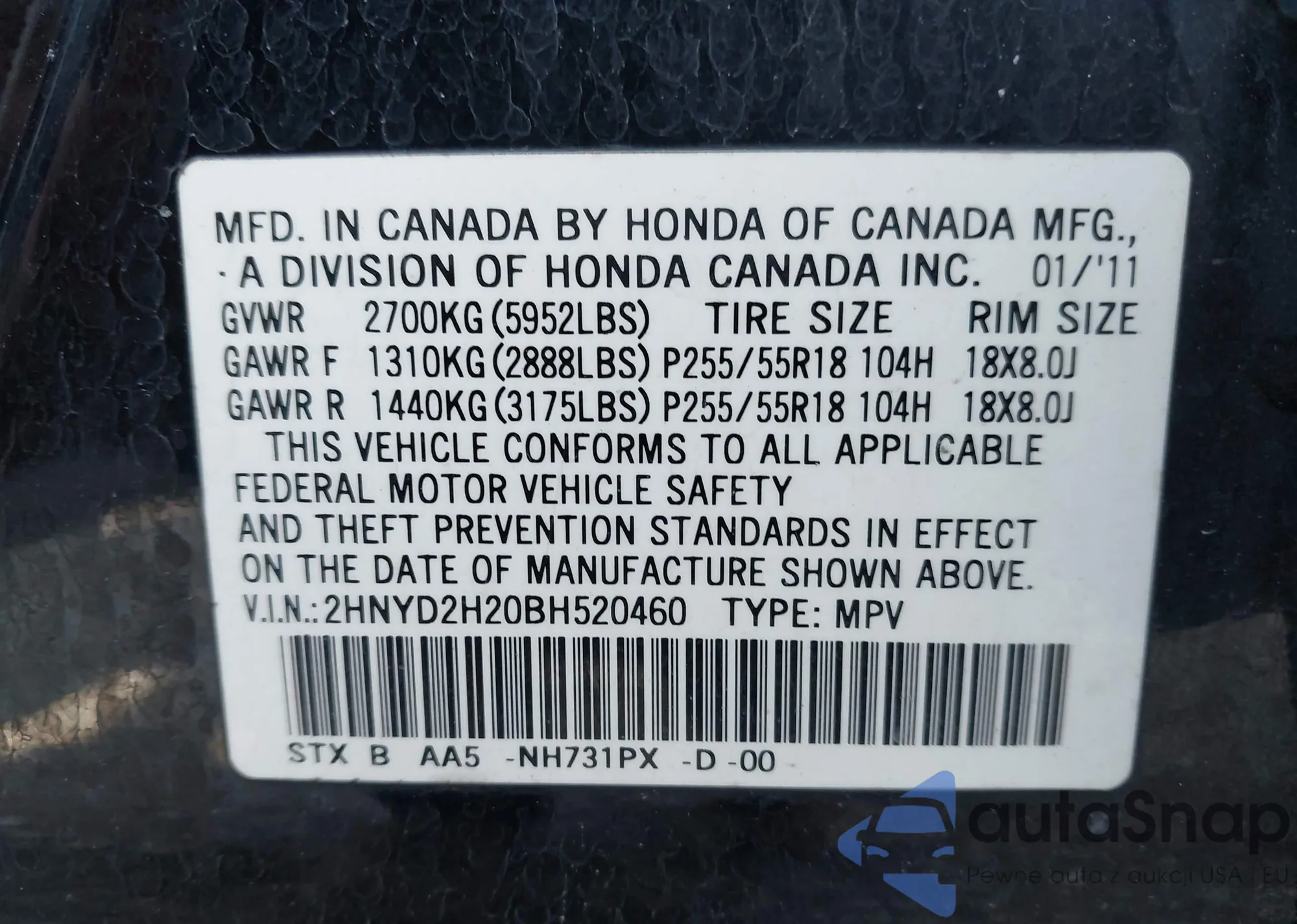 VIN: 2HNYD2H20BH520460