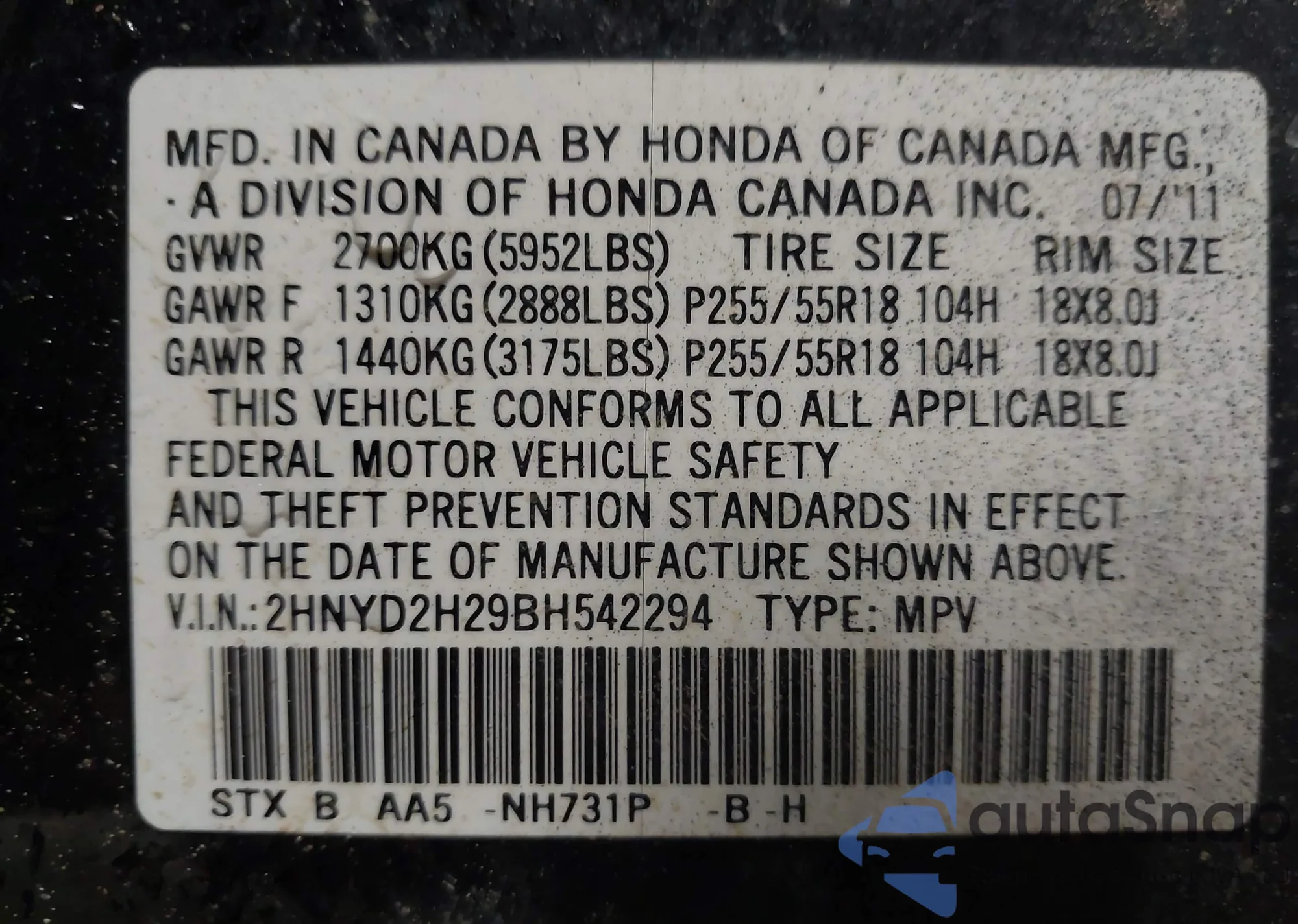 VIN: 2HNYD2H29BH542294