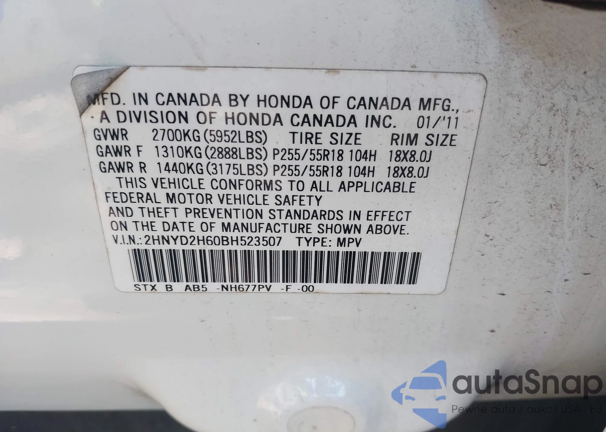 VIN: 2HNYD2H60BH523507