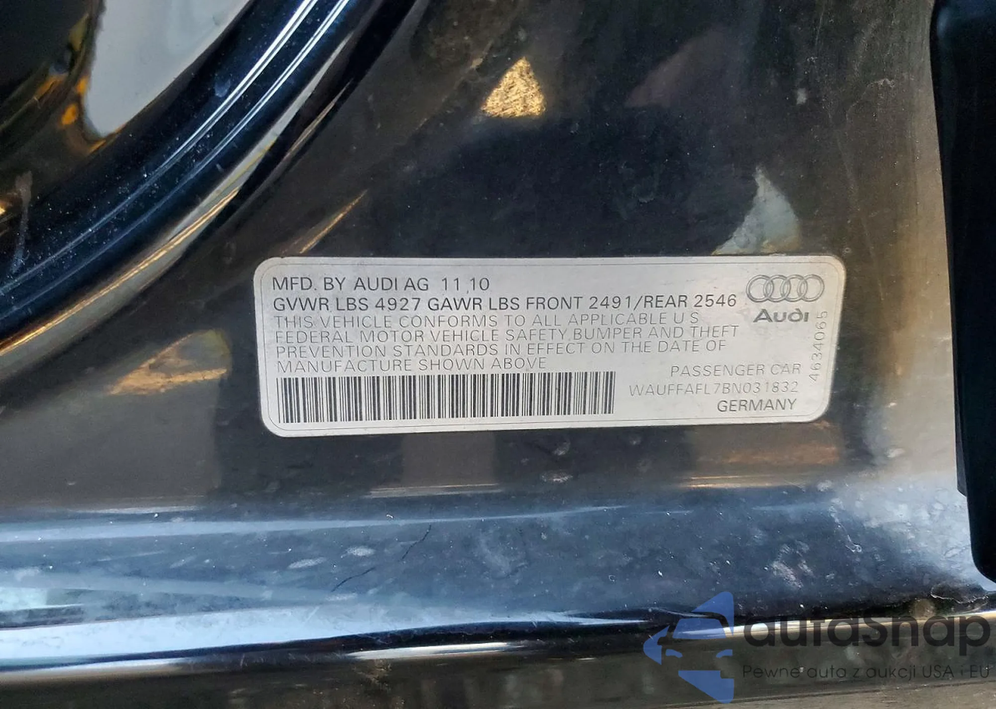 The car Audi A4 2011 (VIN WAUFFAFL7BN031832) has not been auctioned before. The documents are clean, and the mileage matches or is below the market average. Sold by an insurance company – we recommend purchase. Delivery to the port will take approx. 6–8 weeks.