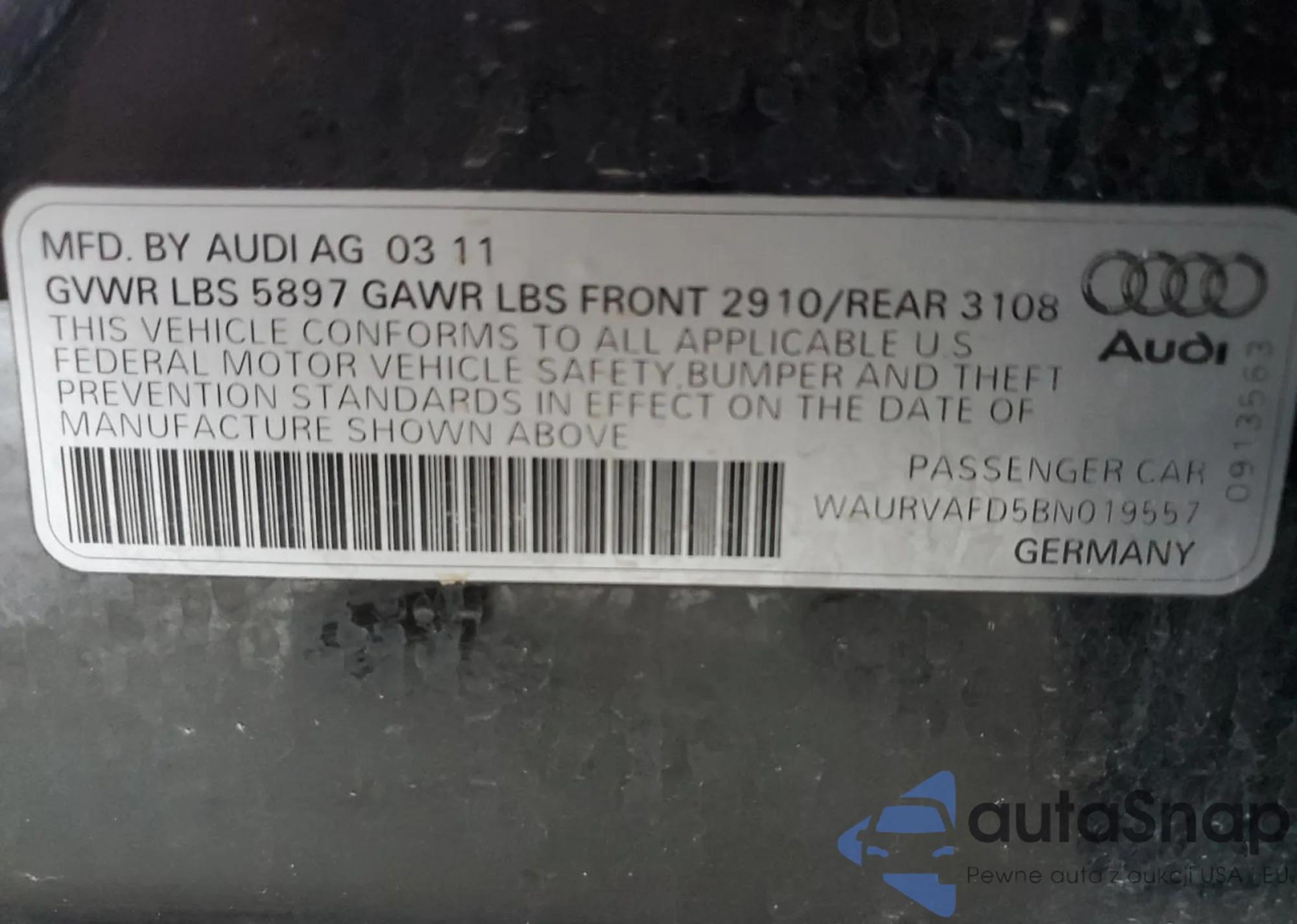 The car Audi A8 2011 (VIN WAURVAFD5BN019557) has already been auctioned 0 times or is sold by an unverified seller. We recommend checking the Carfax report and confirming registration possibilities before purchase.