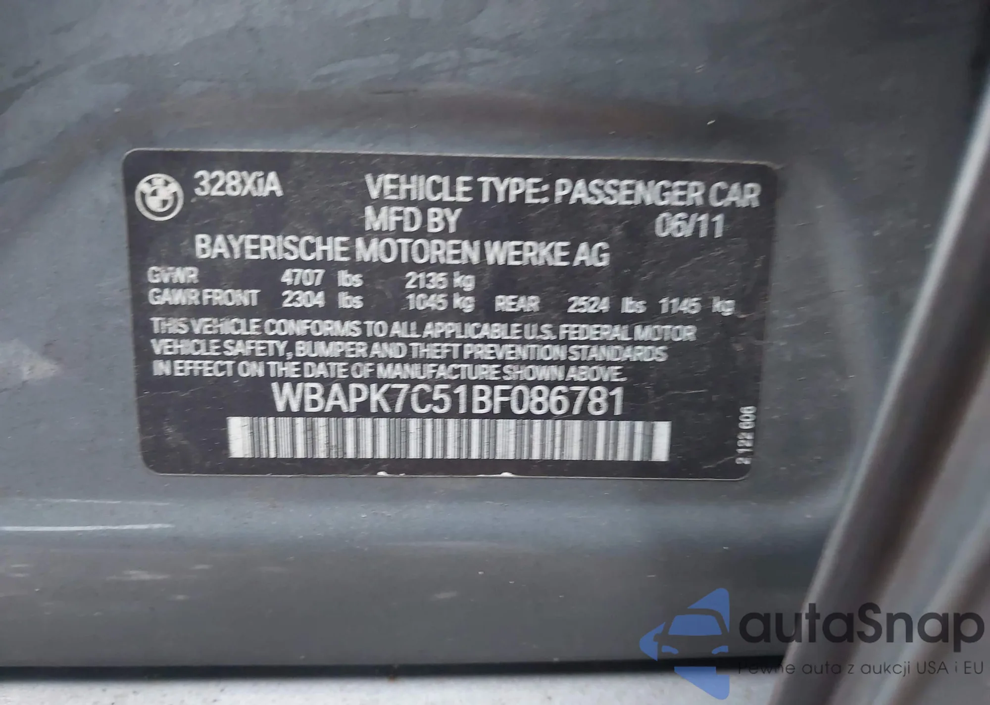 The car BMW 3er 2011 (VIN WBAPK7C51BF086781) has not been auctioned before. The documents are clean, and the mileage matches or is below the market average. Sold by an insurance company – we recommend purchase. Delivery to the port will take approx. 6–8 weeks.