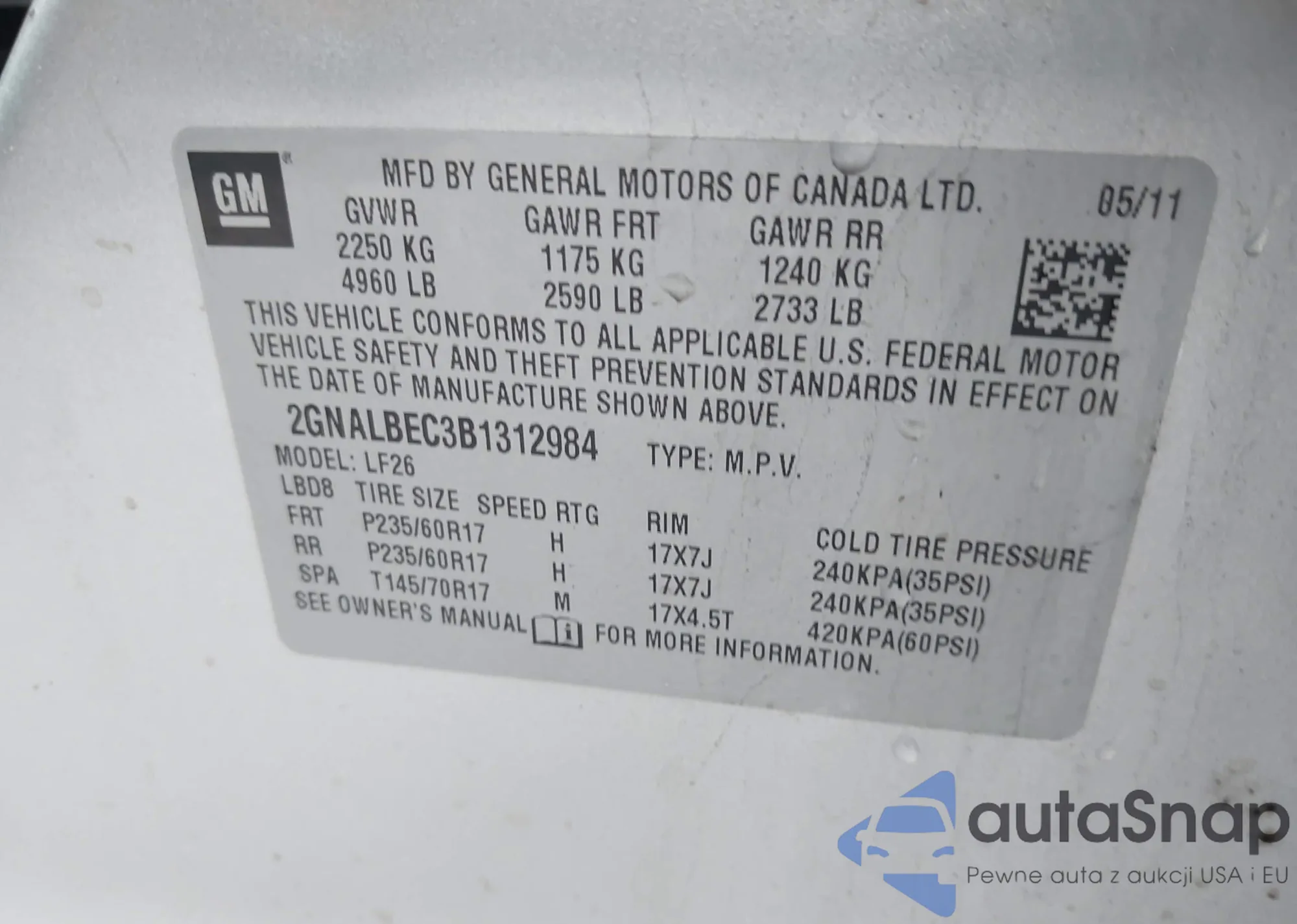 The car Chevrolet Equinox 2011 (VIN 2GNALBEC3B1312984) has not been auctioned before. The documents are clean, and the mileage matches or is below the market average. Sold by an insurance company – we recommend purchase. Delivery to the port will take approx. 6–8 weeks.