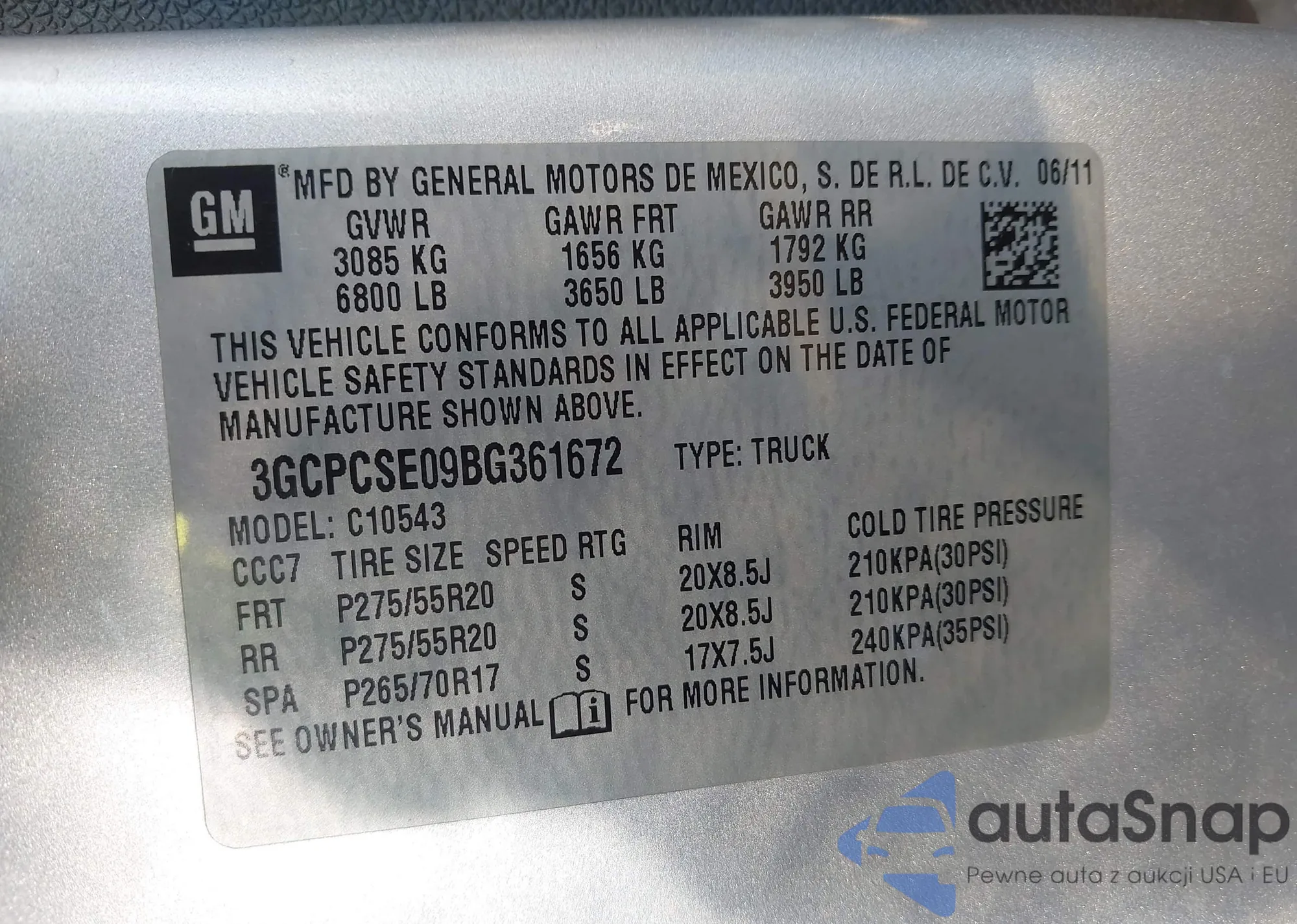 • VIN: 3GCPCSE09BG361672