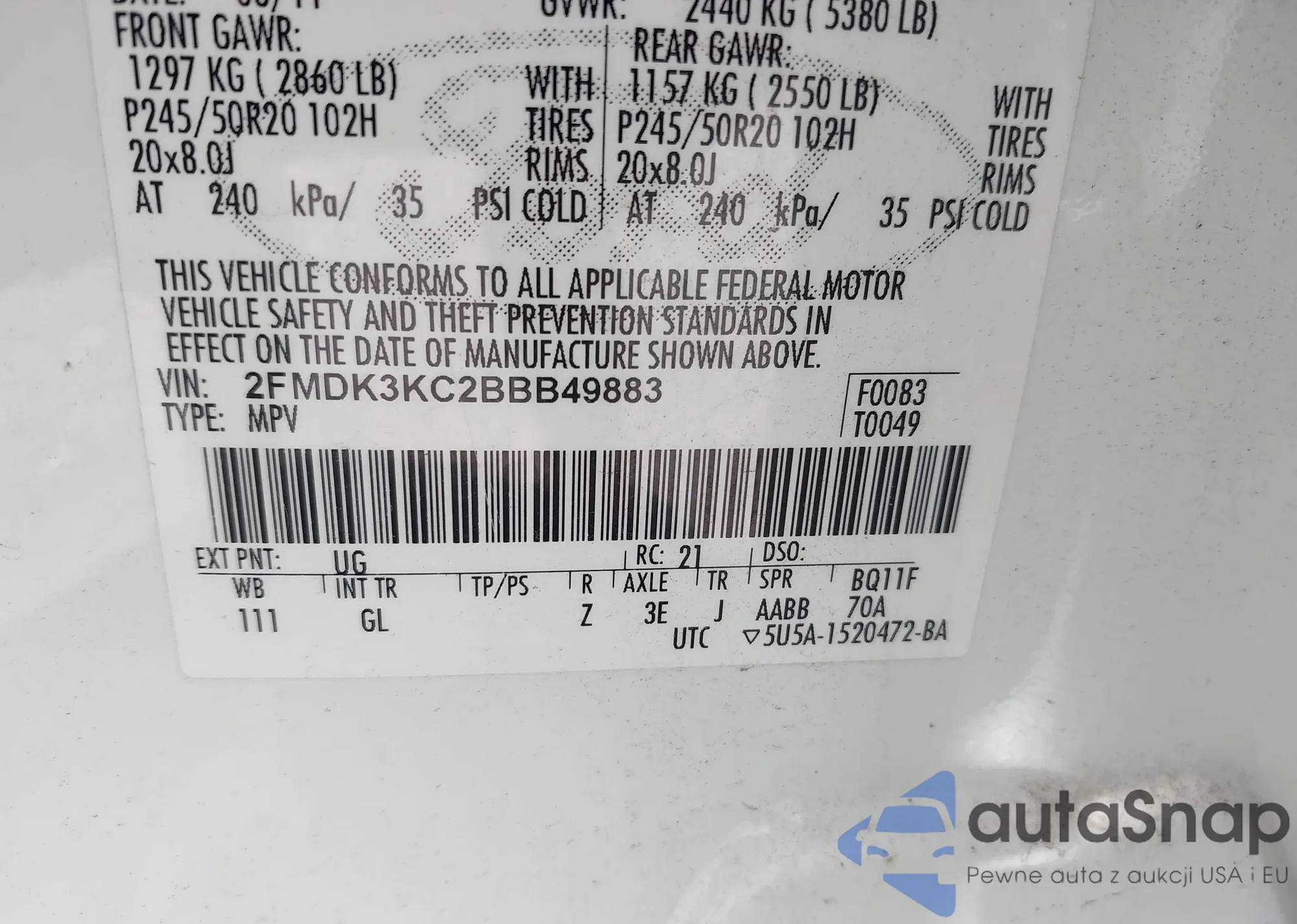 VIN: 2FMDK3KC2BBB49883