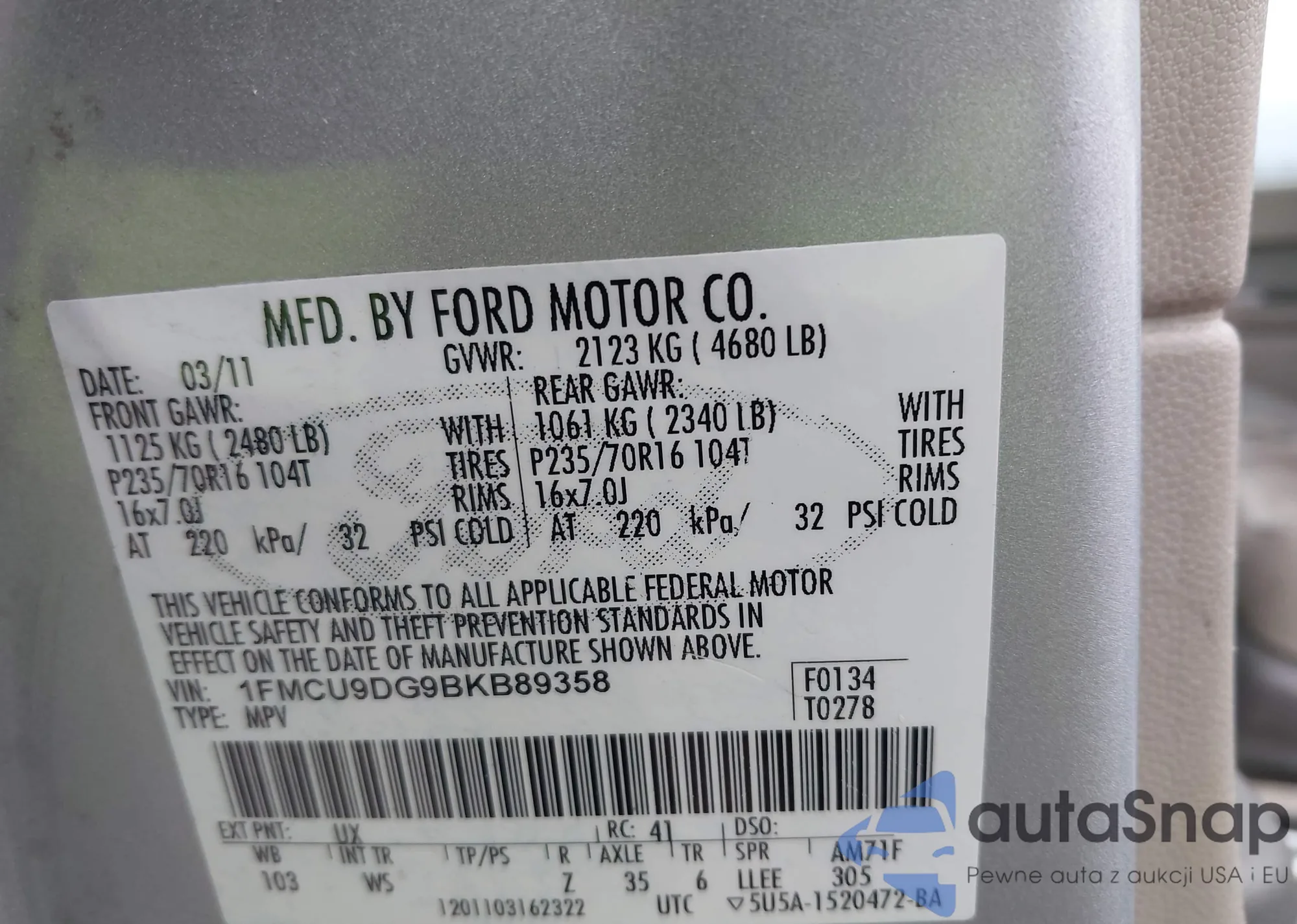 The car Ford Escape 2011 (VIN 1FMCU9DG9BKB89358) has not been auctioned before. The documents are clean, and the mileage matches or is below the market average. Sold by an insurance company – we recommend purchase. Delivery to the port will take approx. 6–8 weeks.