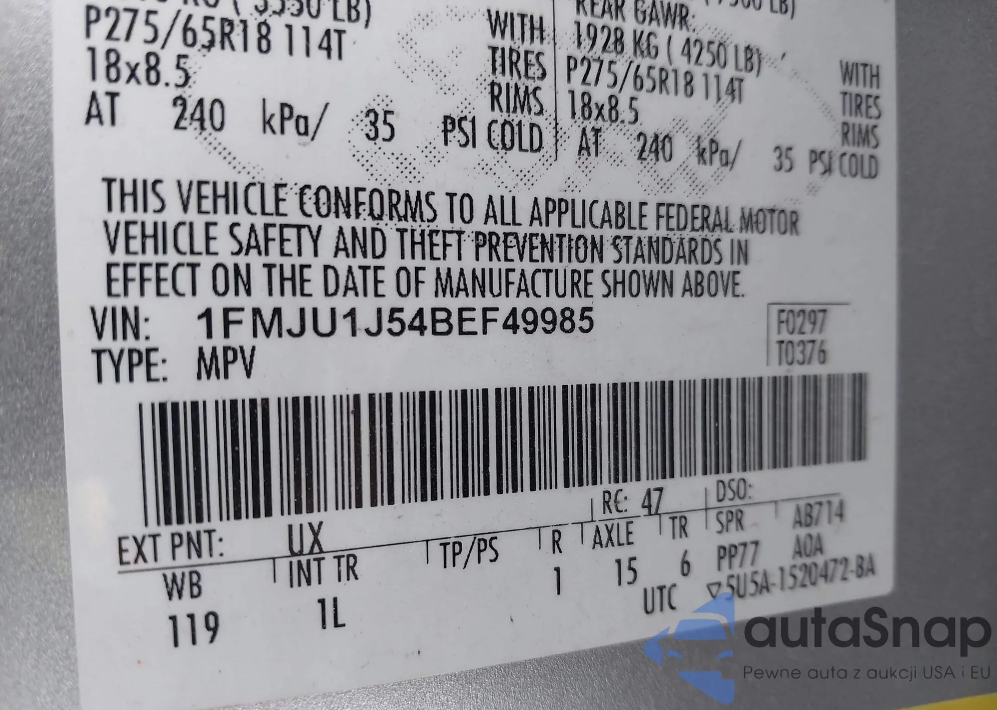 The car Ford Expedition 2011 (VIN 1FMJU1J54BEF49985) has not been auctioned before. The documents are clean, and the mileage matches or is below the market average. Sold by an insurance company – we recommend purchase. Delivery to the port will take approx. 6–8 weeks.