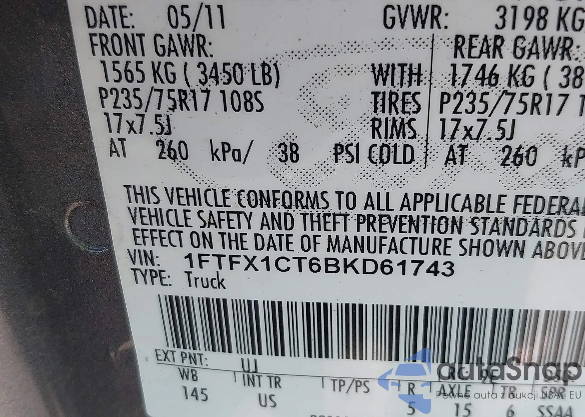 VIN: 1FTFX1CT6BKD61743