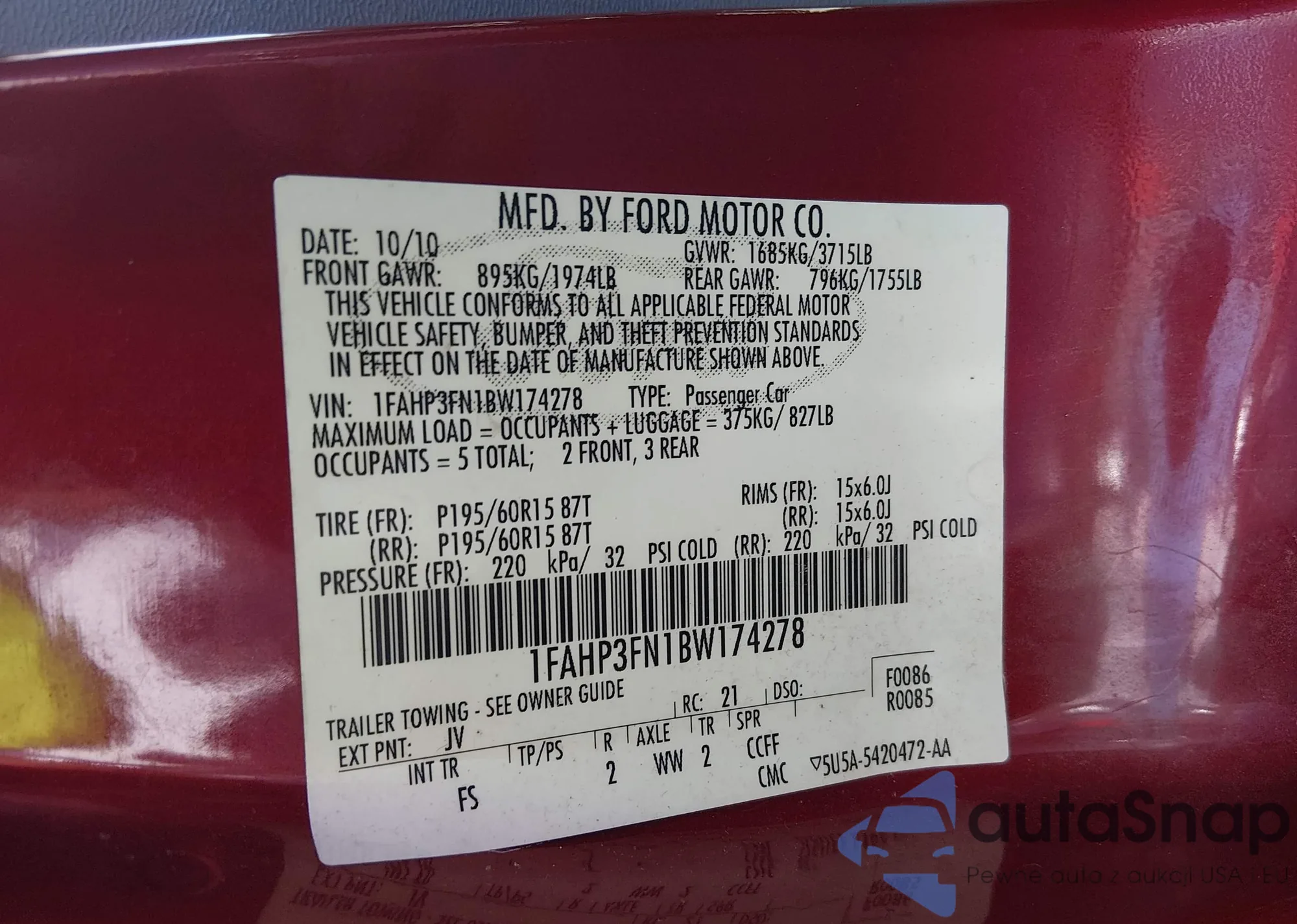 The car Ford Focus 2011 (VIN 1FAHP3FN1BW174278) has not been auctioned before. The documents are clean, and the mileage matches or is below the market average. Sold by an insurance company – we recommend purchase. Delivery to the port will take approx. 6–8 weeks.