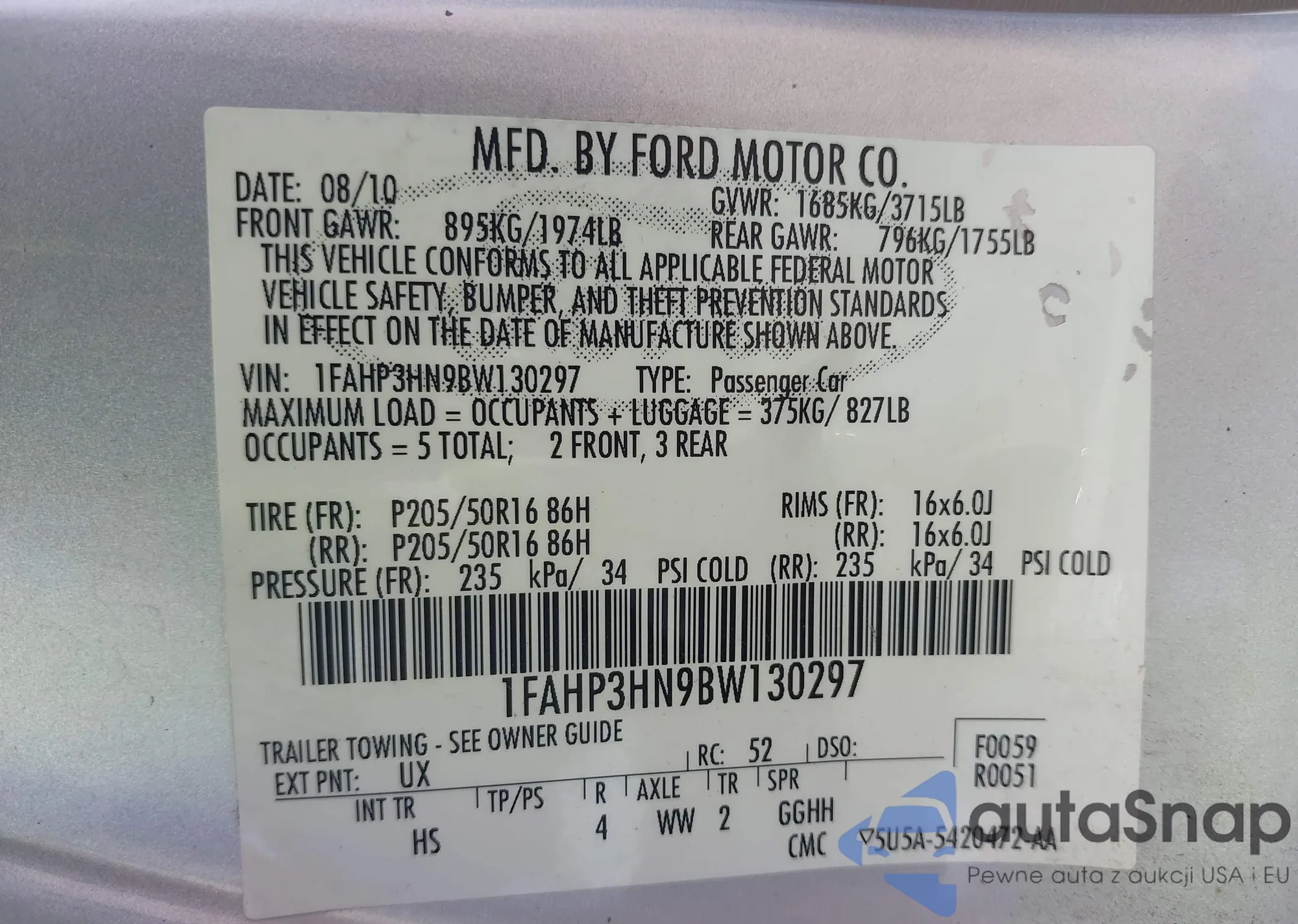 VIN: 1FAHP3HN9BW130297