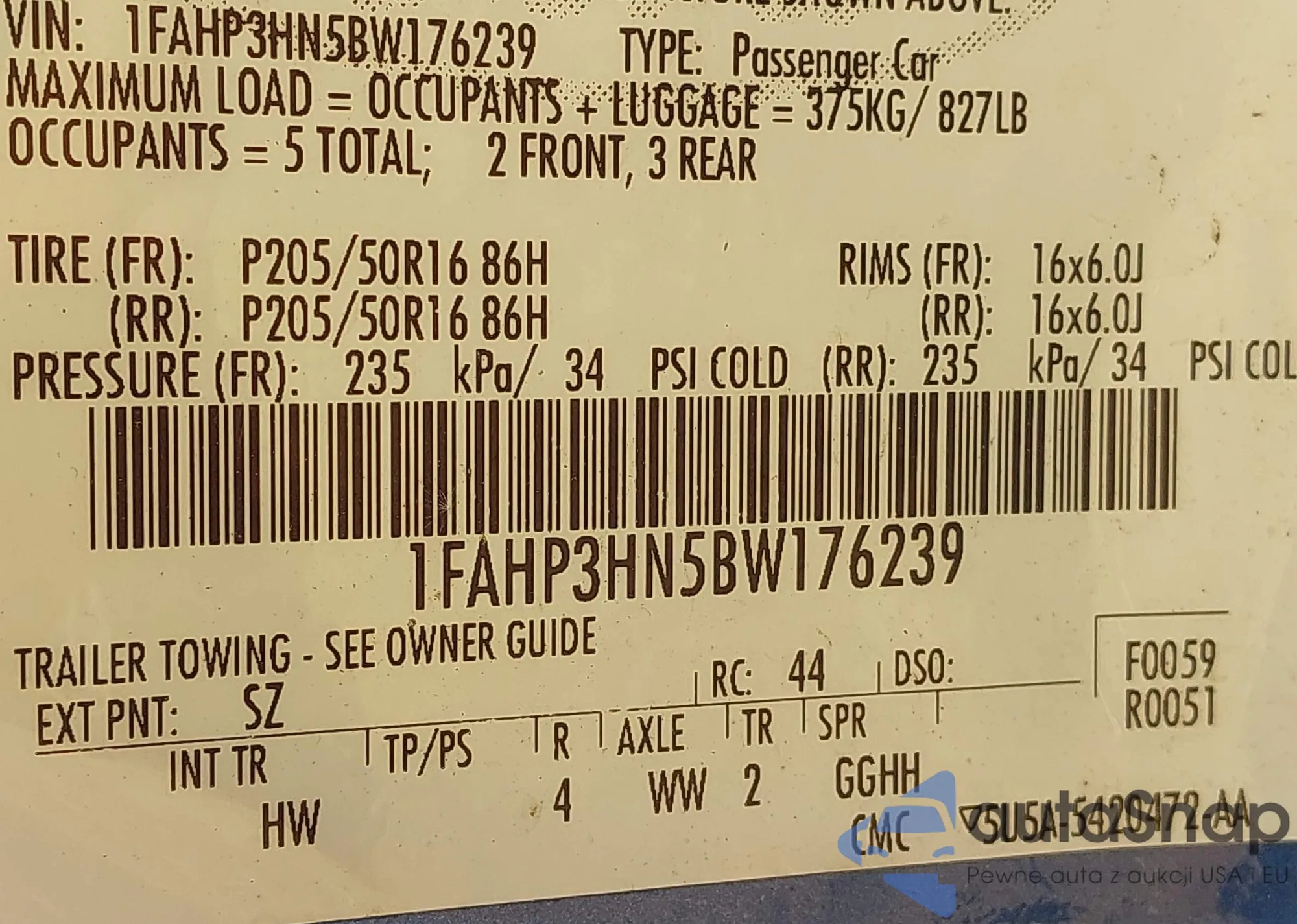 VIN: 1FAHP3HN5BW176239