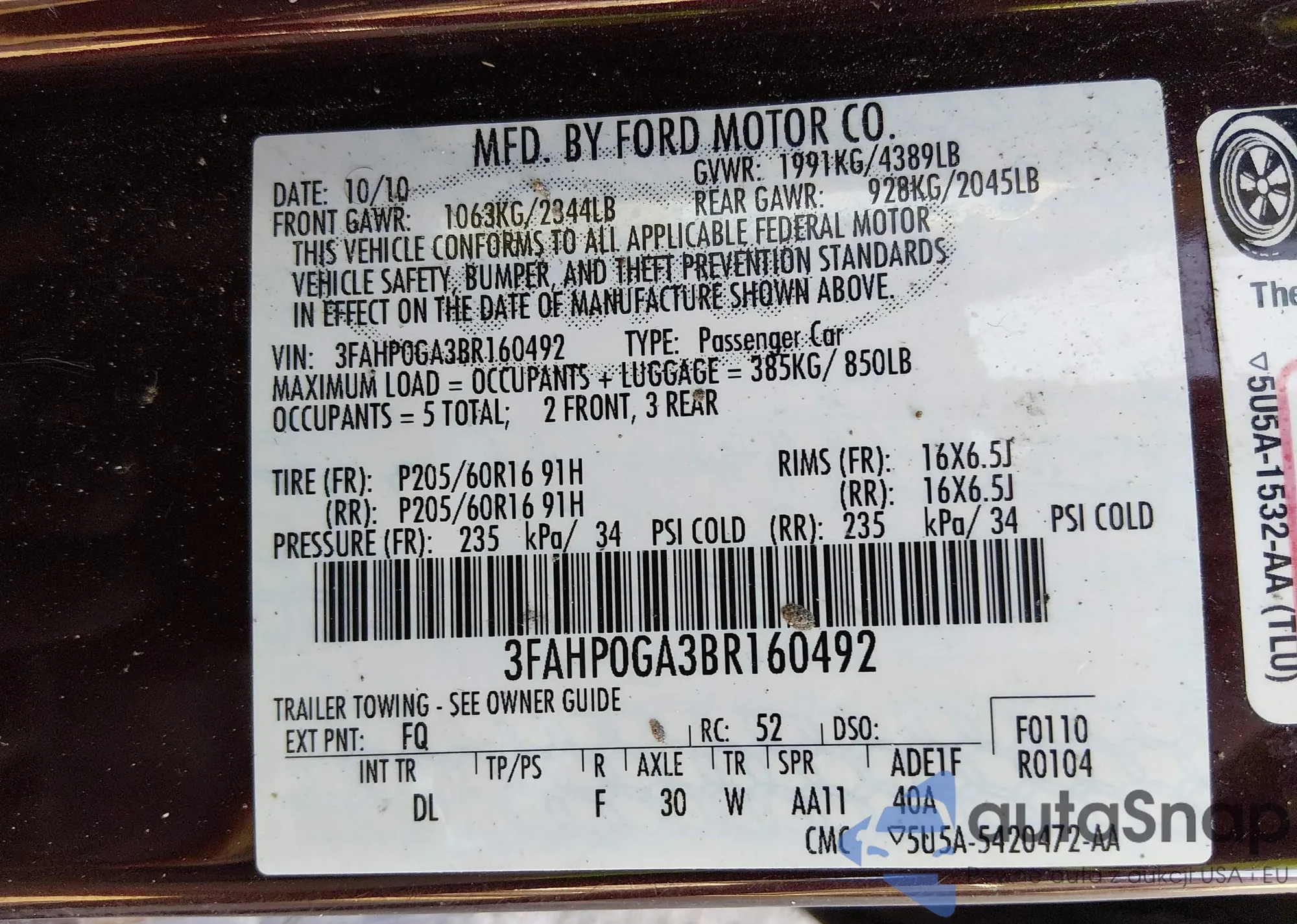The car Ford Fusion 2011 (VIN 3FAHP0GA3BR160492) has not been auctioned before. The documents are clean, and the mileage matches or is below the market average. Sold by an insurance company – we recommend purchase. Delivery to the port will take approx. 6–8 weeks.