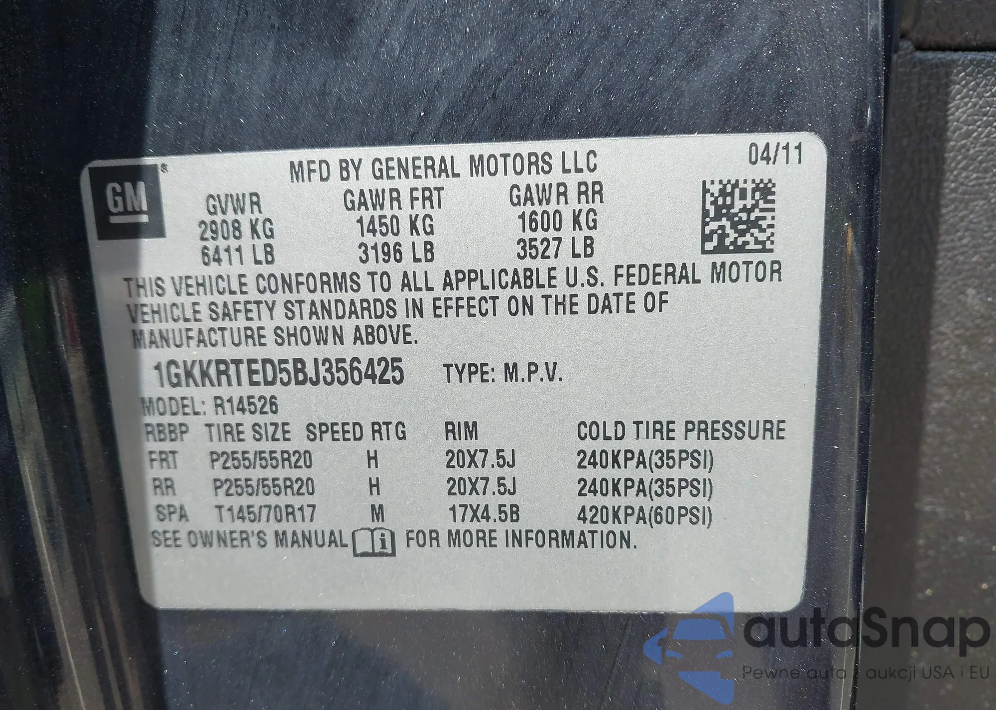 The car GMC Acadia 2011 (VIN 1GKKRTED5BJ356425) has not been auctioned before. The documents are clean, and the mileage matches or is below the market average. Sold by an insurance company – we recommend purchase. Delivery to the port will take approx. 6–8 weeks.
