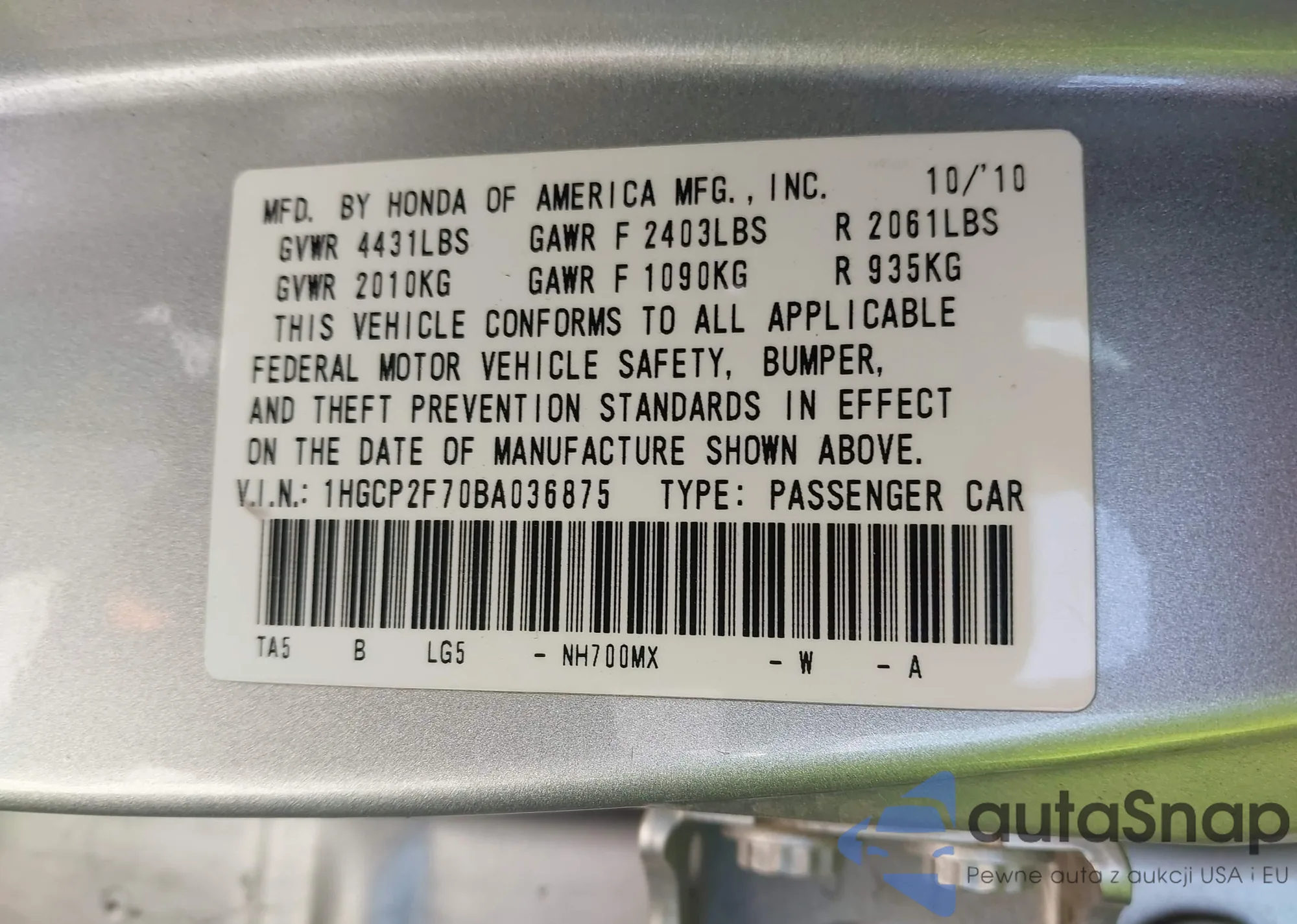 • VIN: 1HGCP2F70BA036875