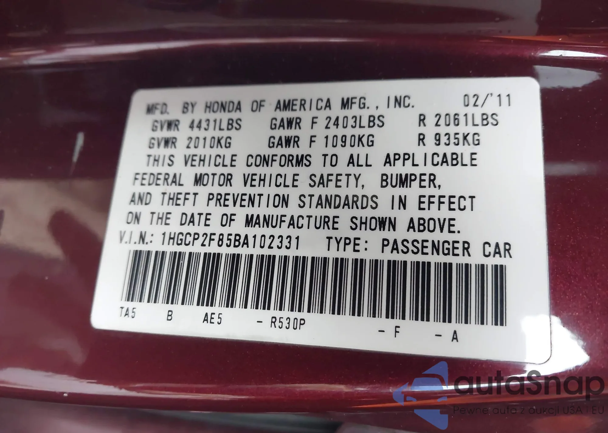 VIN: 1HGCP2F85BA102331