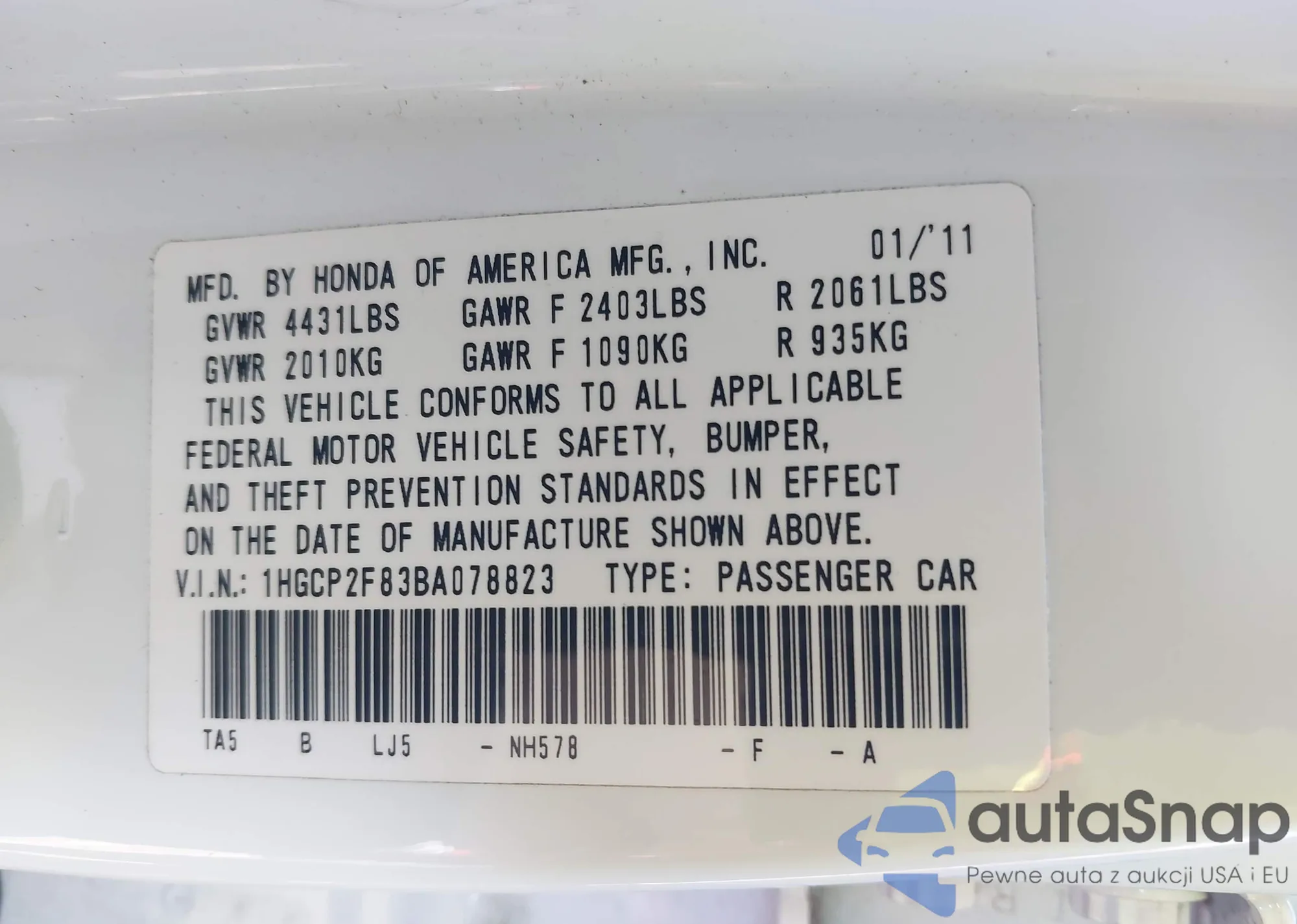 VIN: 1HGCP2F83BA078823