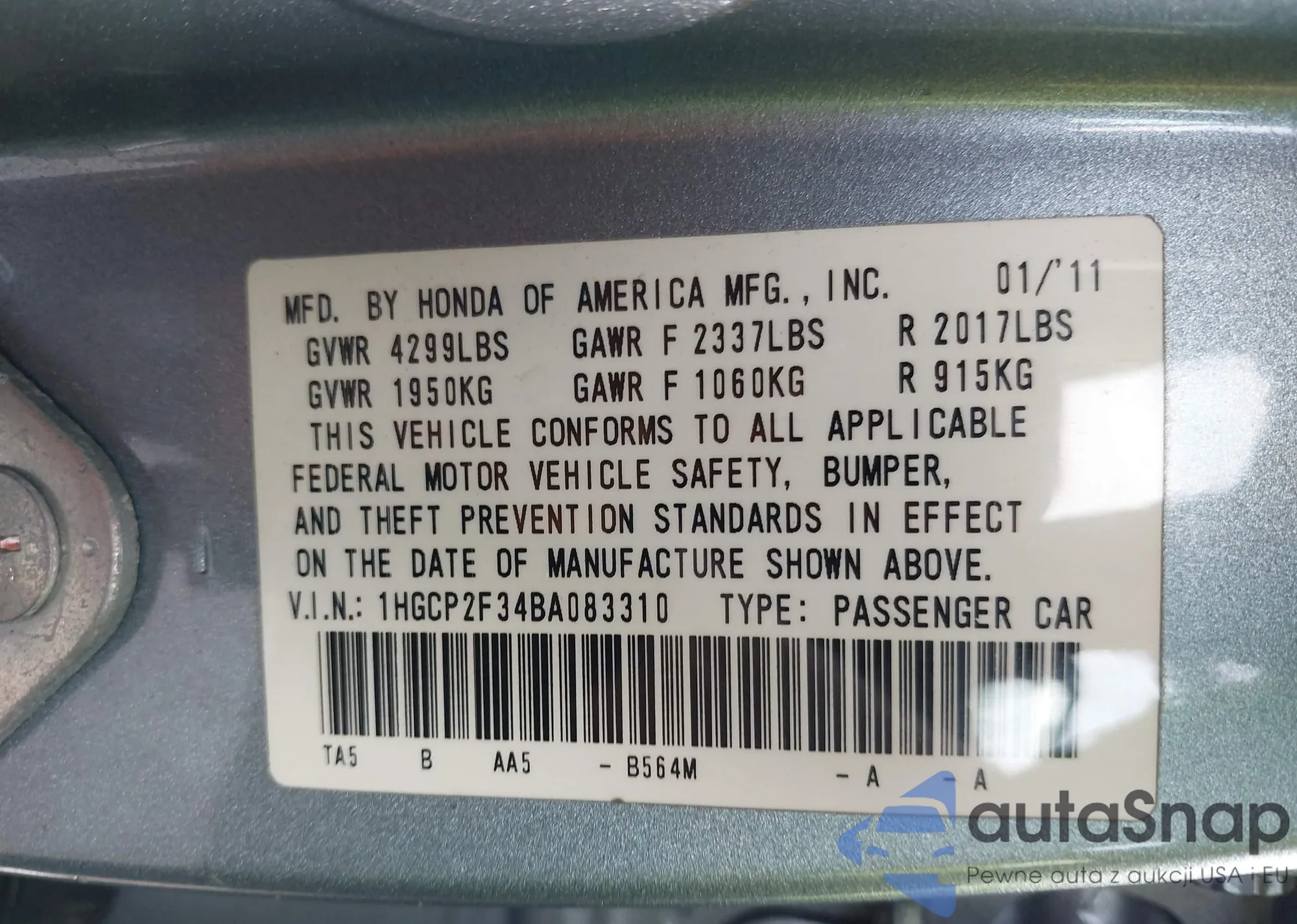 VIN: 1HGCP2F34BA083310