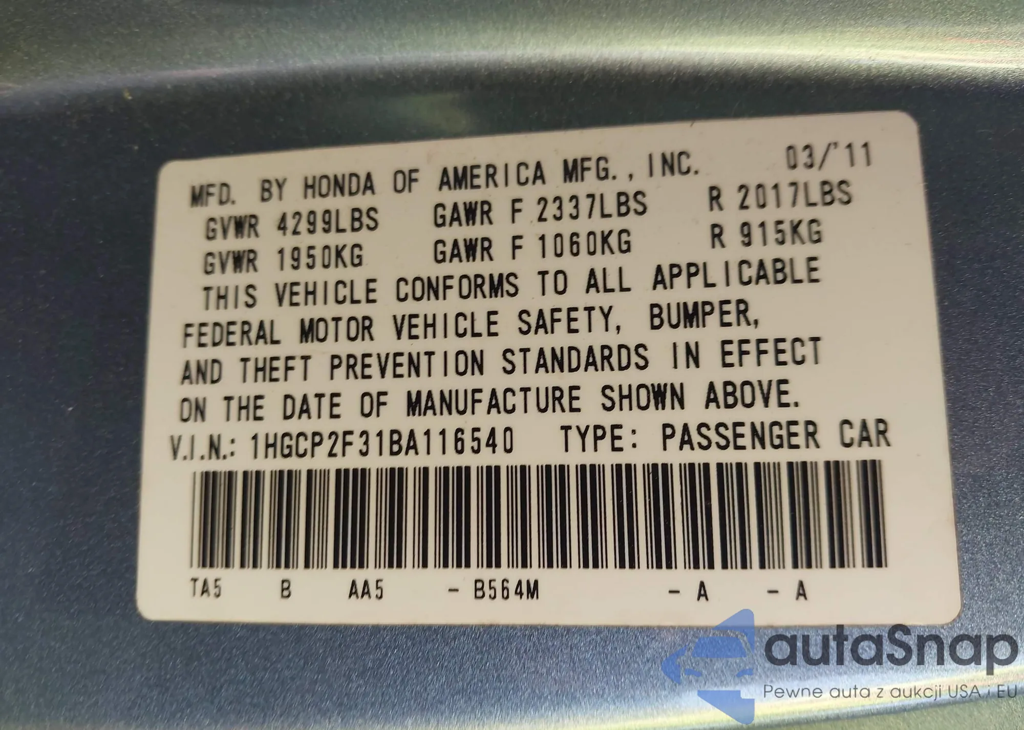 VIN: 1HGCP2F31BA116540