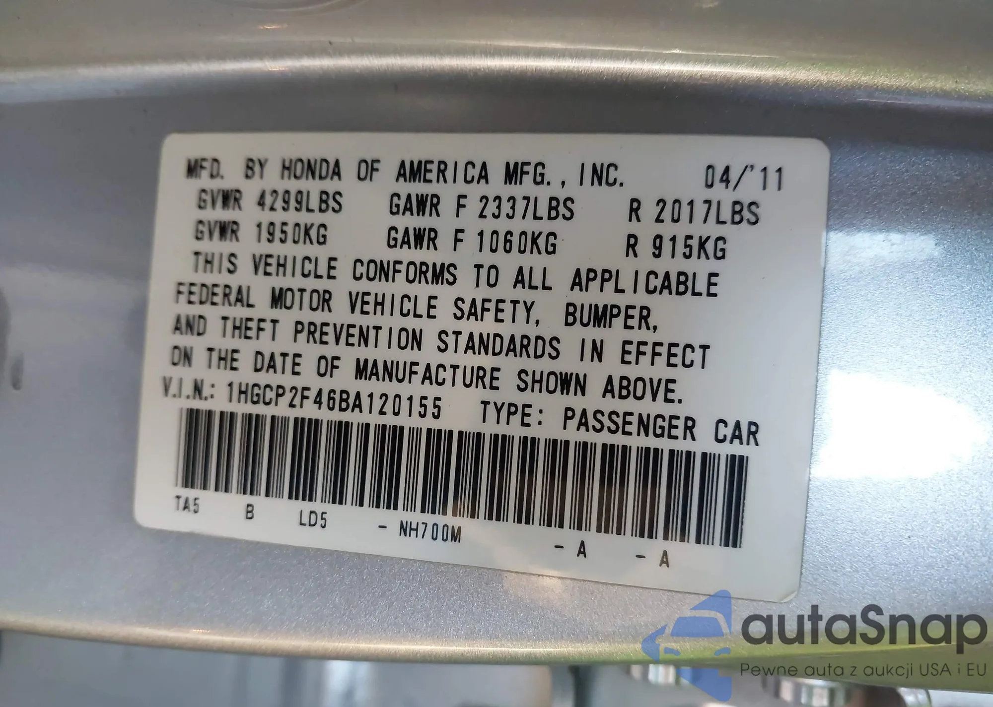The car Honda Accord 2011 (VIN 1HGCP2F46BA120155) is sold by an unverified seller. We recommend checking the Carfax report and confirming registration possibilities before purchase.