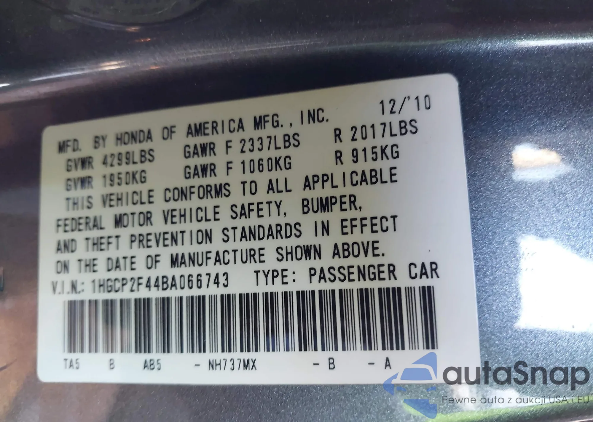 VIN: 1HGCP2F44BA066743