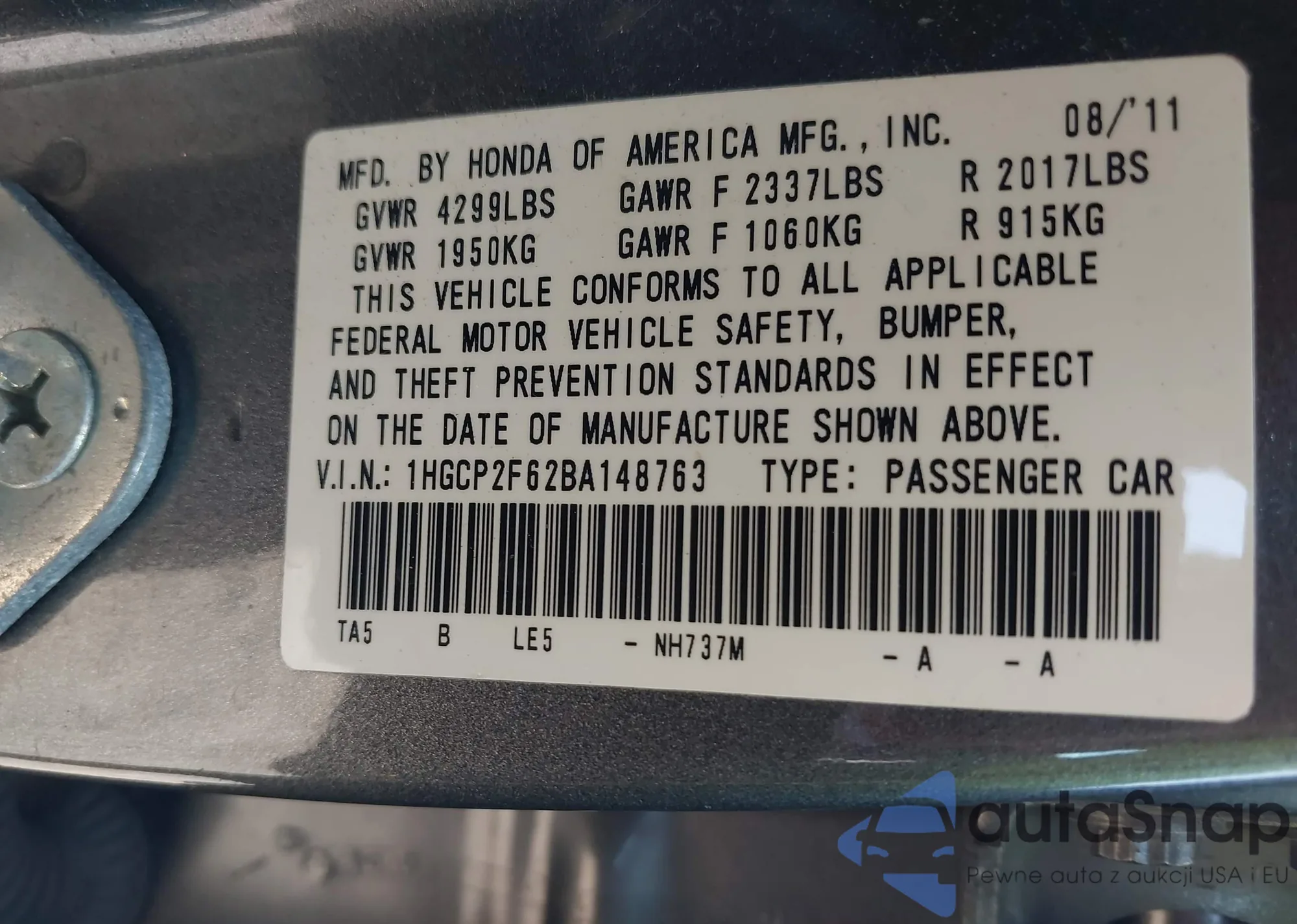 VIN: 1HGCP2F62BA148763
