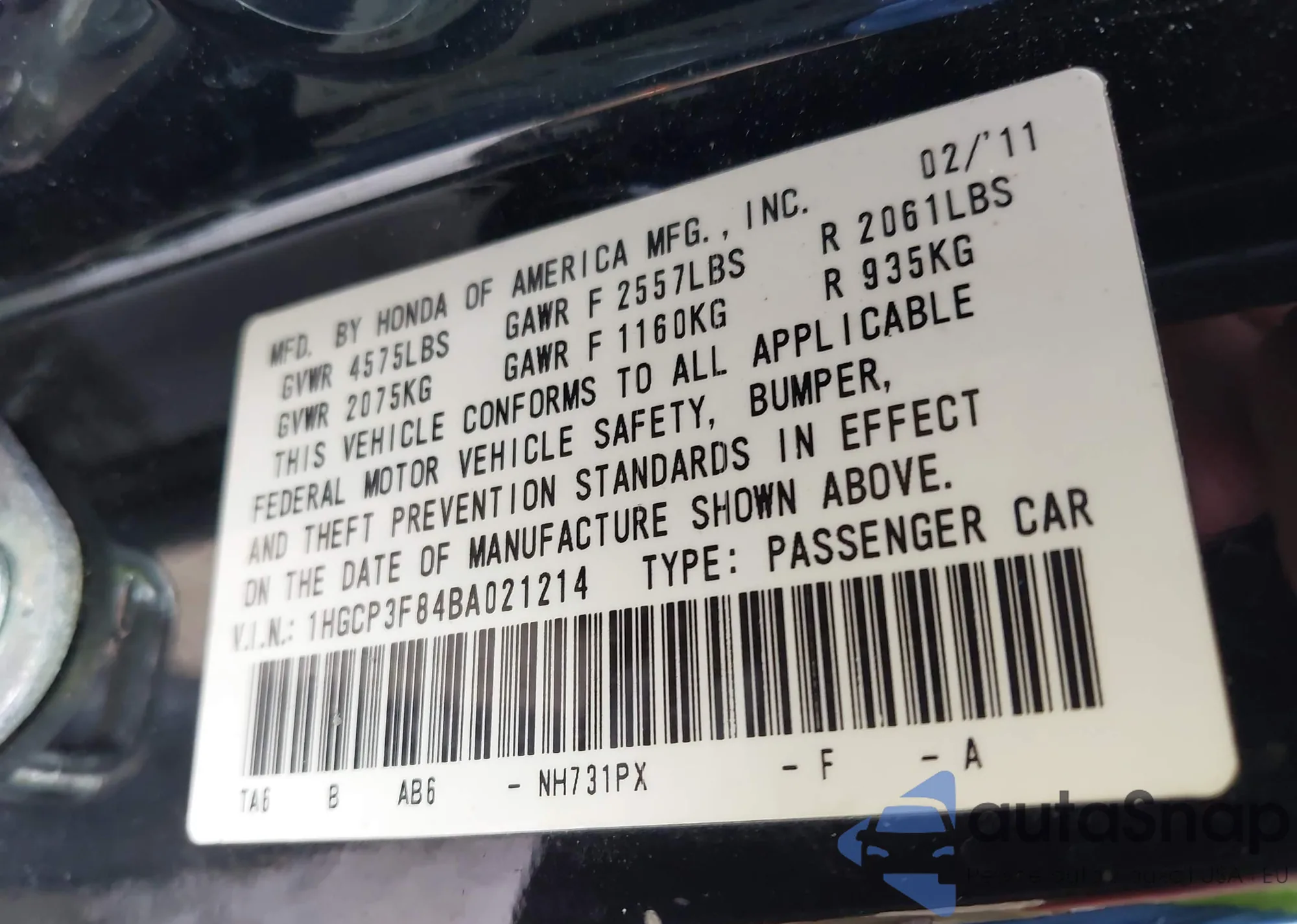 VIN: 1HGCP3F84BA021214