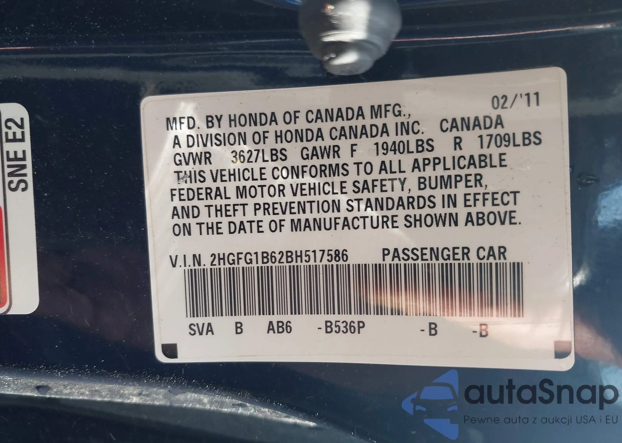 VIN: 2HGFG1B62BH517586