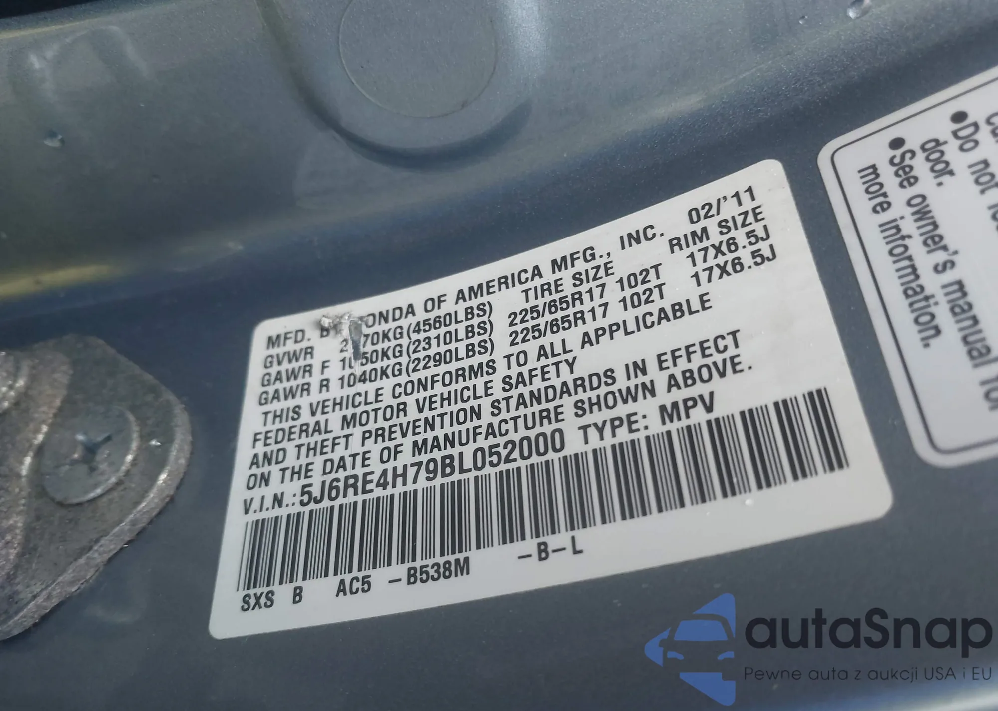 VIN: 5J6RE4H79BL052000