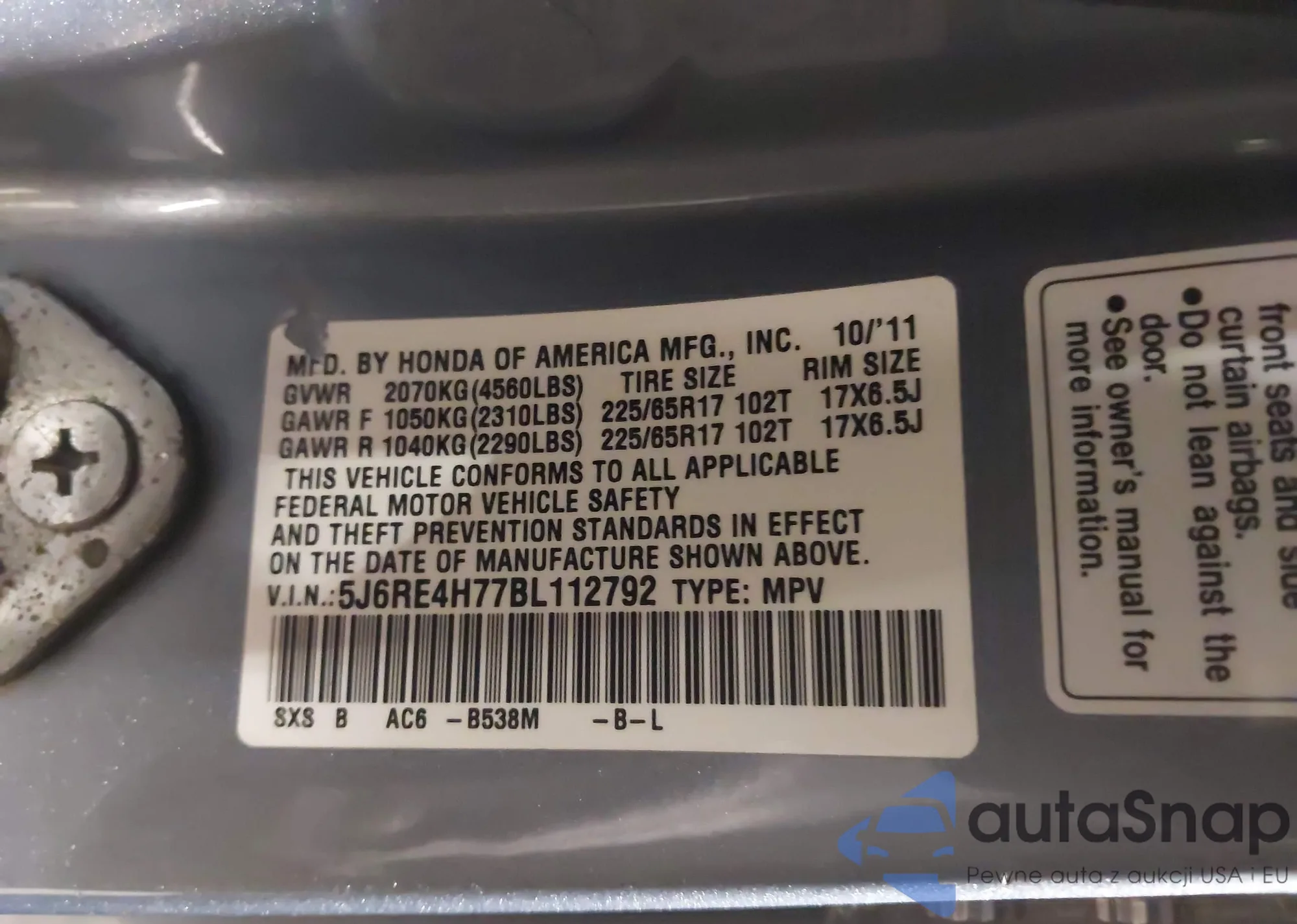 The car Honda CR-V 2011 (VIN 5J6RE4H77BL112792) has not been auctioned before. The documents are clean, and the mileage matches or is below the market average. Sold by an insurance company – we recommend purchase. Delivery to the port will take approx. 6–8 weeks.