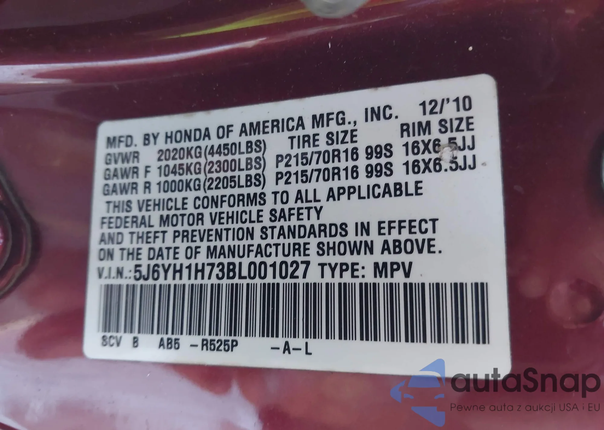 • VIN: 5J6YH1H73BL001027