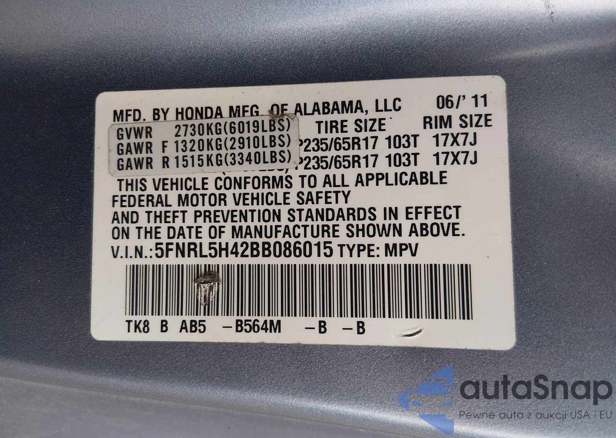 The car Honda Odyssey 2011 (VIN 5FNRL5H42BB086015) is sold by an unverified seller. We recommend checking the Carfax report and confirming registration possibilities before purchase.