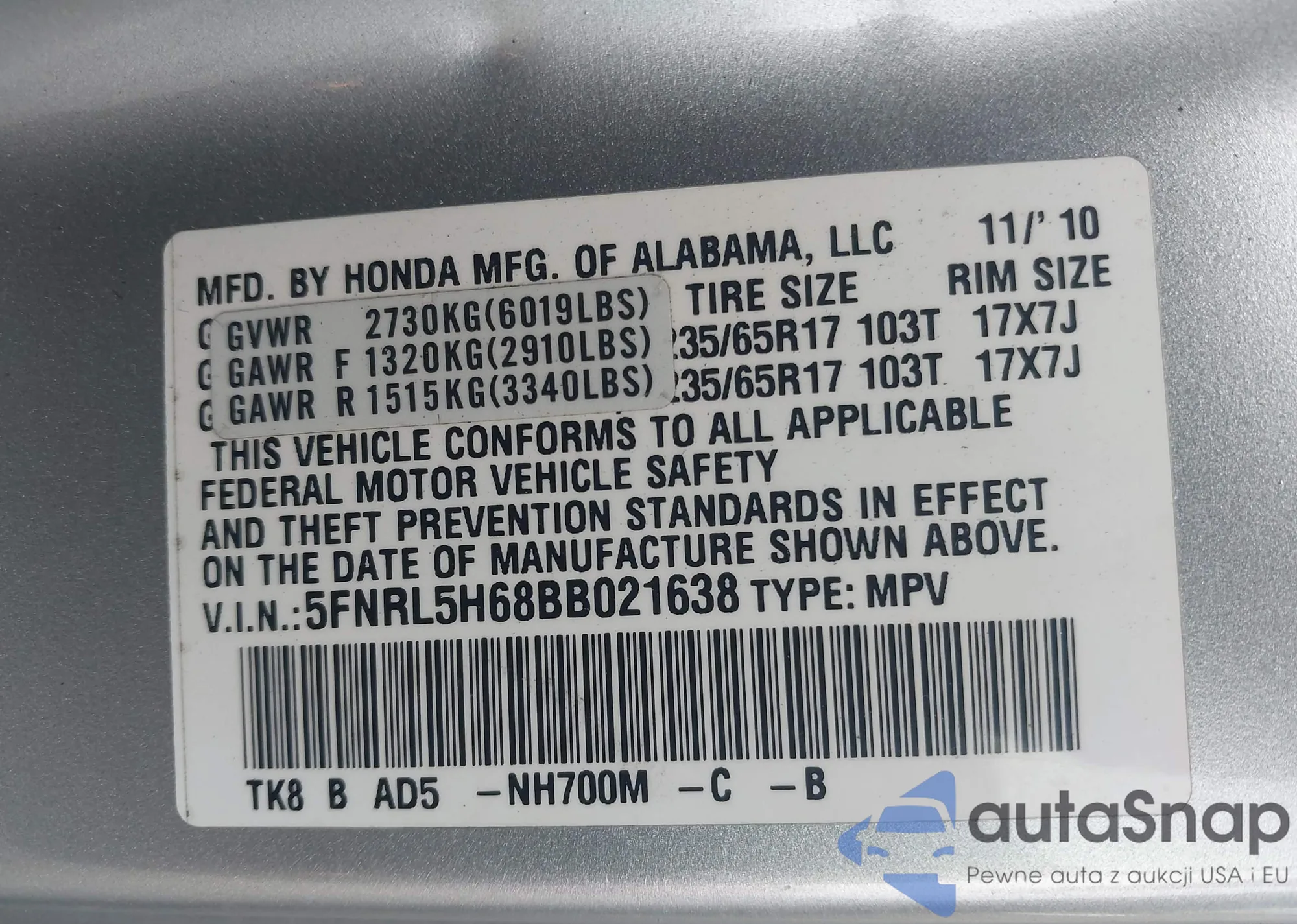 VIN: 5FNRL5H68BB021638