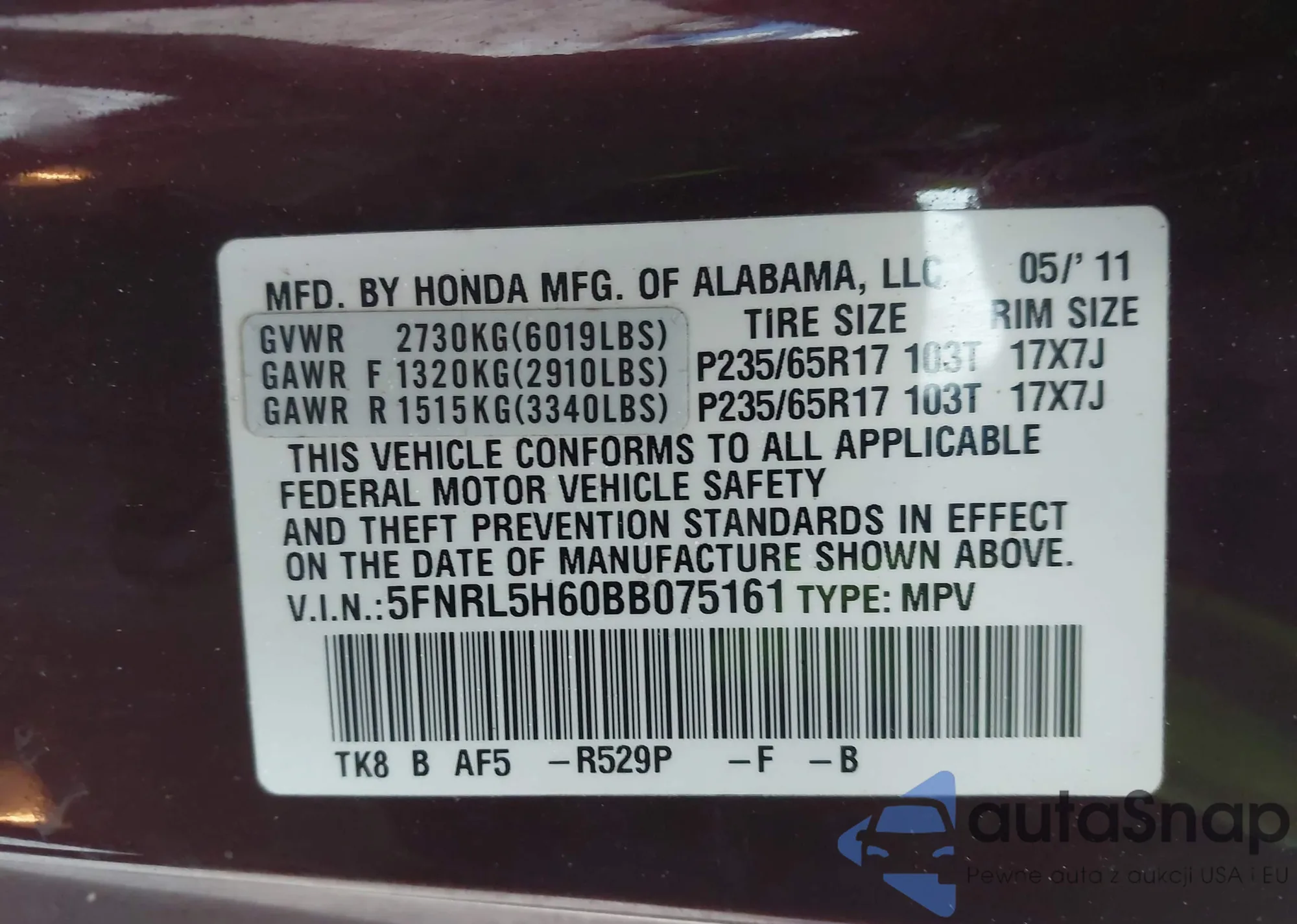 The car Honda Odyssey 2011 (VIN 5FNRL5H60BB075161) has not been auctioned before. The documents are clean, and the mileage matches or is below the market average. Sold by an insurance company – we recommend purchase. Delivery to the port will take approx. 6–8 weeks.