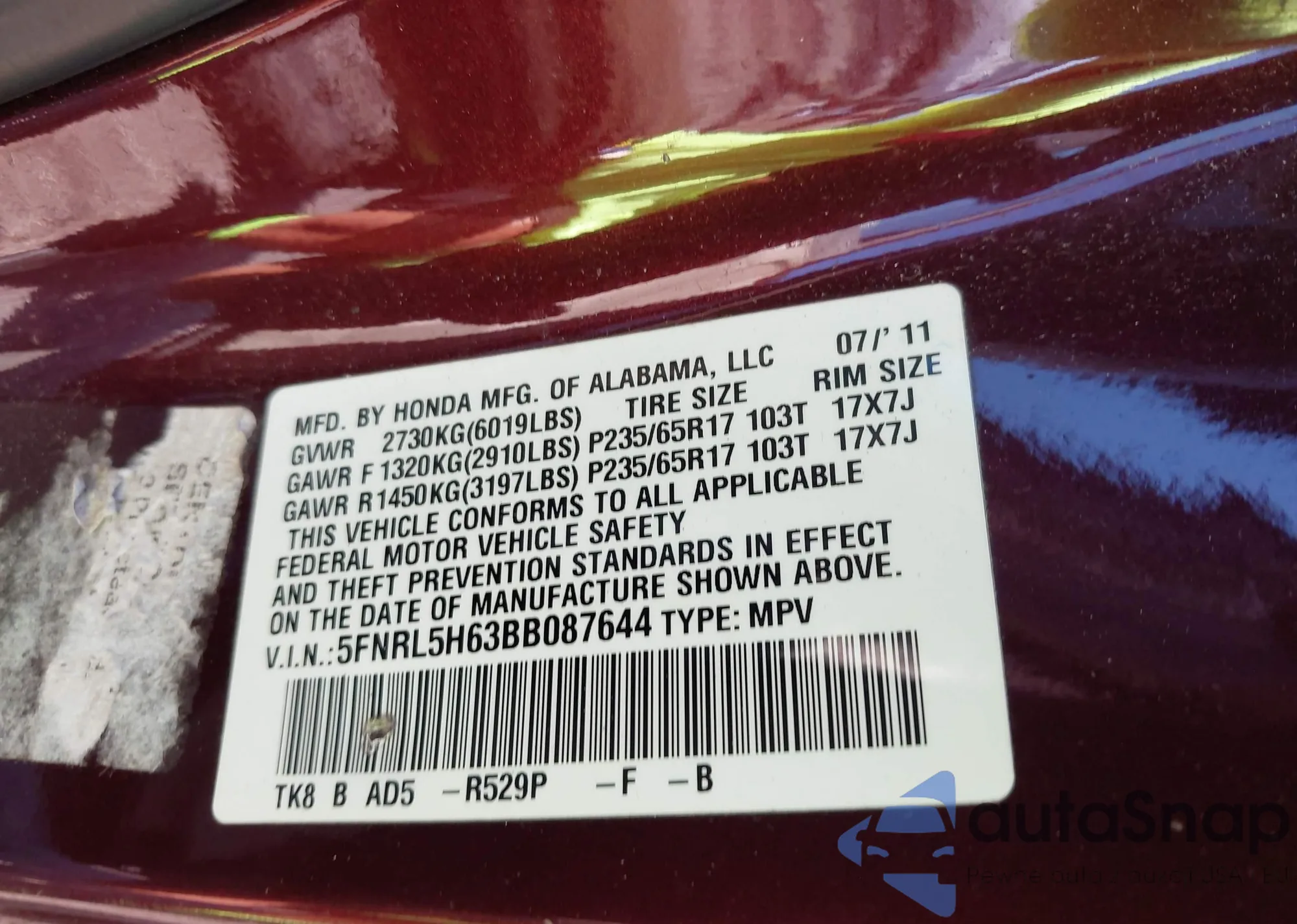 VIN: 5FNRL5H63BB087644