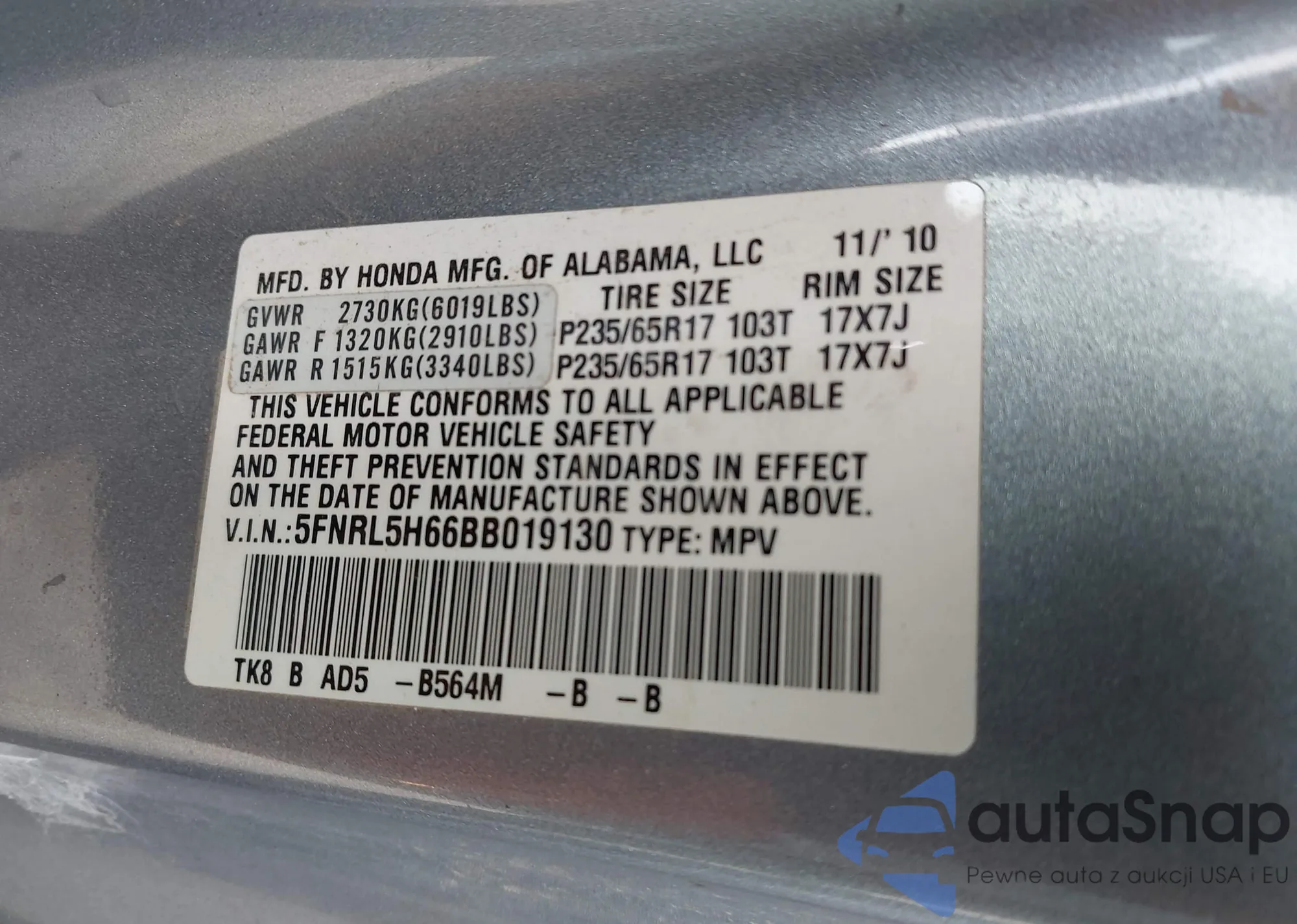 VIN: 5FNRL5H66BB019130