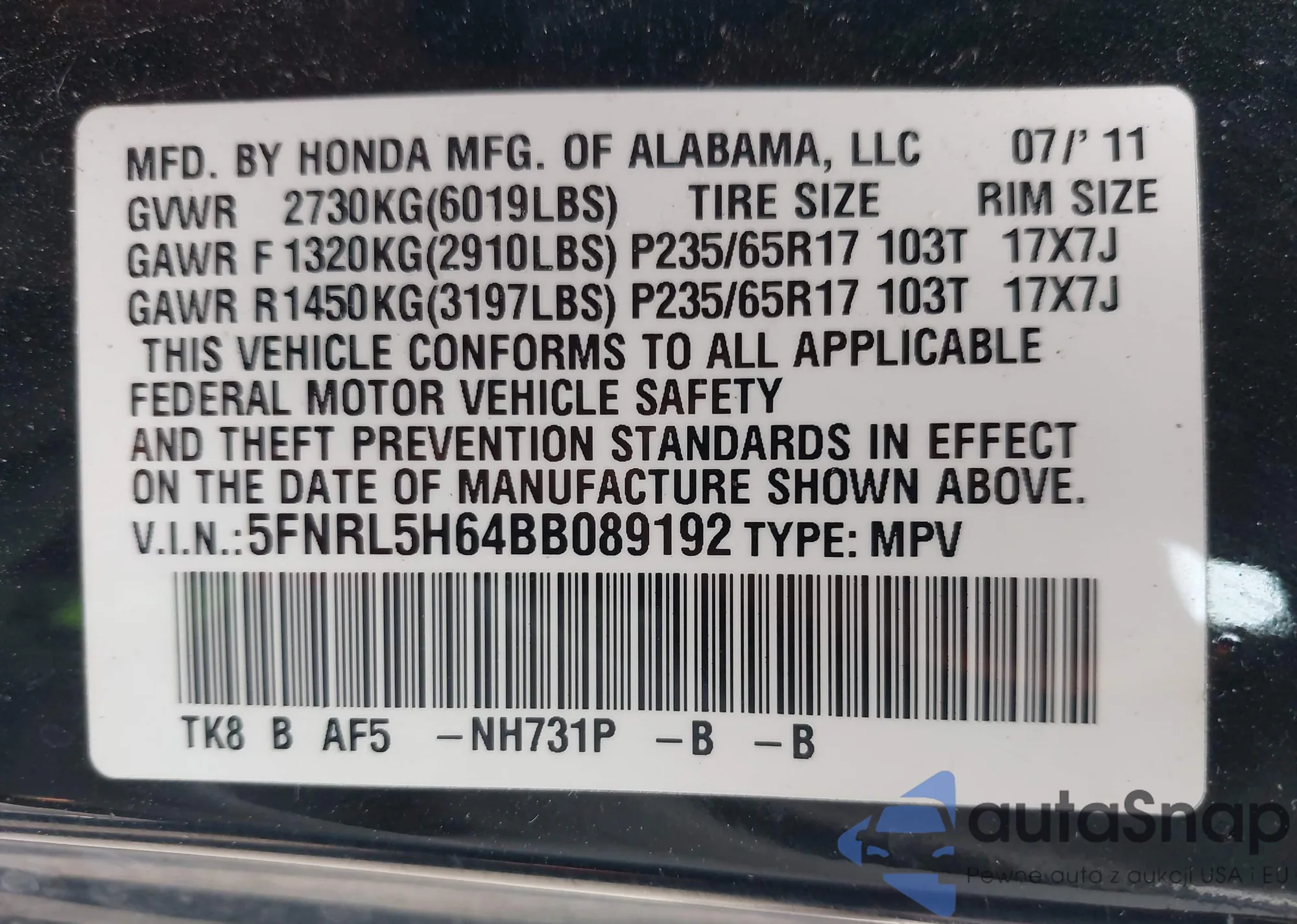 The car Honda Odyssey 2011 (VIN 5FNRL5H64BB089192) has not been auctioned before. The documents are clean, and the mileage matches or is below the market average. Sold by an insurance company – we recommend purchase. Delivery to the port will take approx. 6–8 weeks.