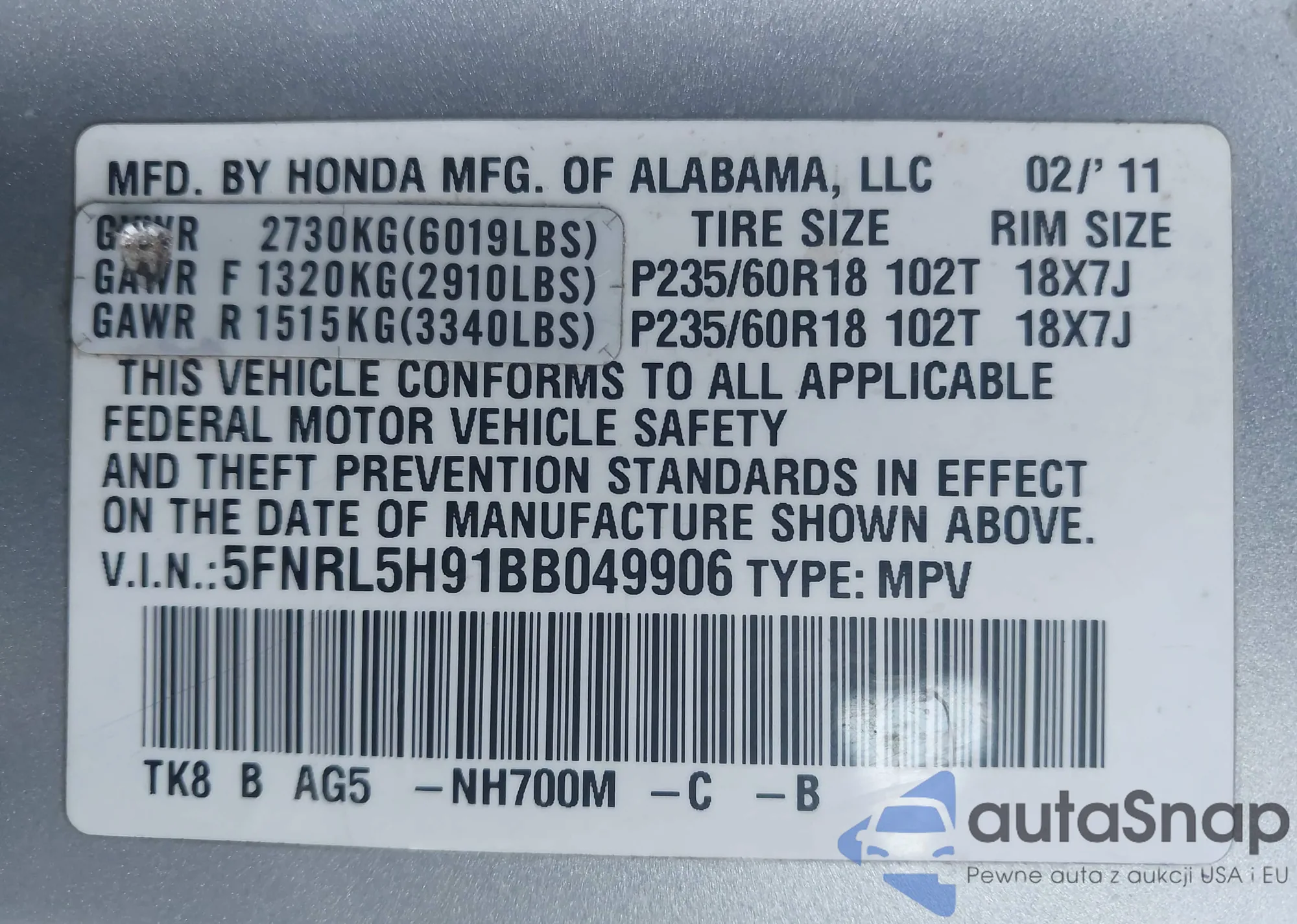 The car Honda Odyssey 2011 (VIN 5FNRL5H91BB049906) is sold by an unverified seller. We recommend checking the Carfax report and confirming registration possibilities before purchase.