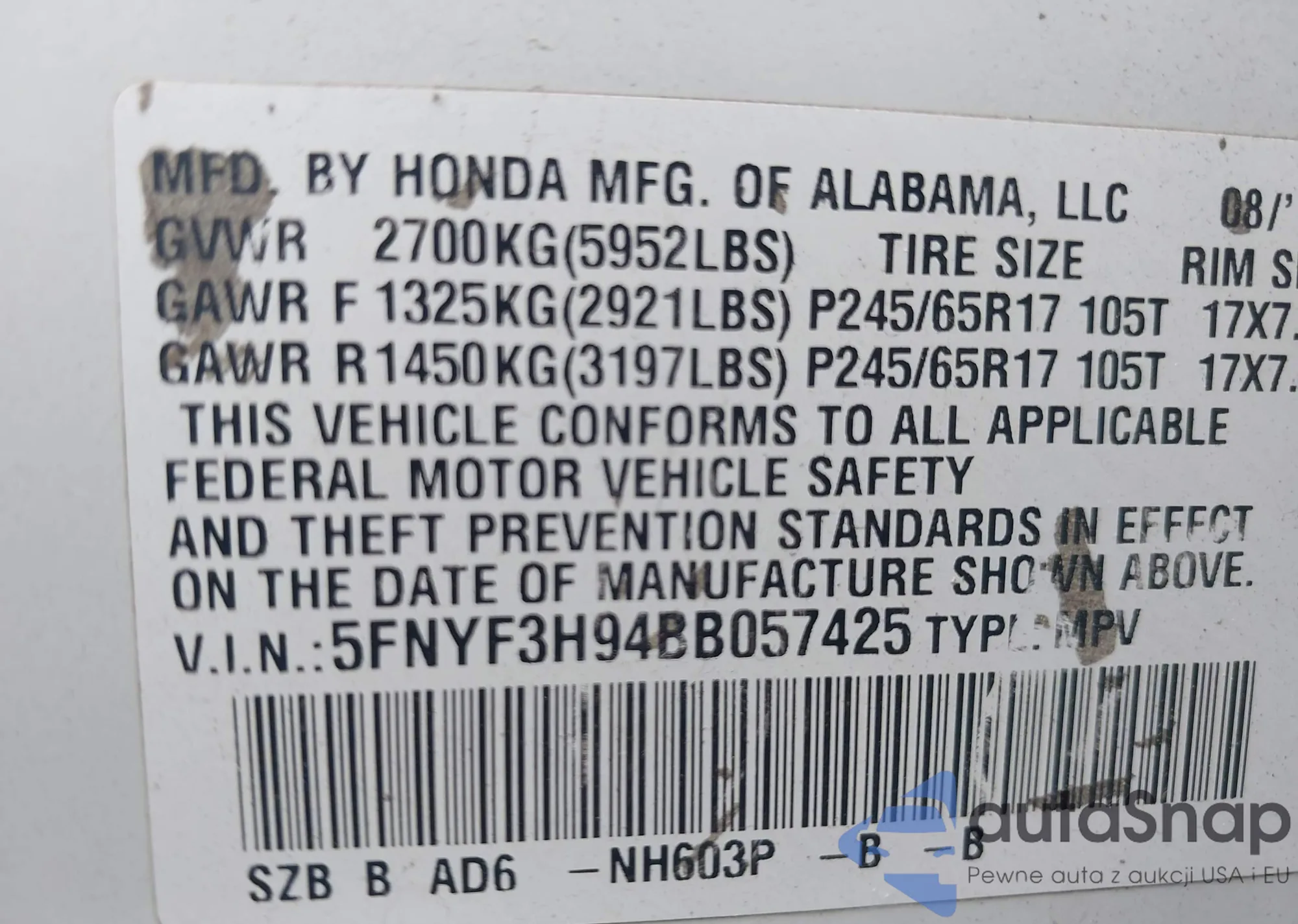 VIN: 5FNYF3H94BB057425