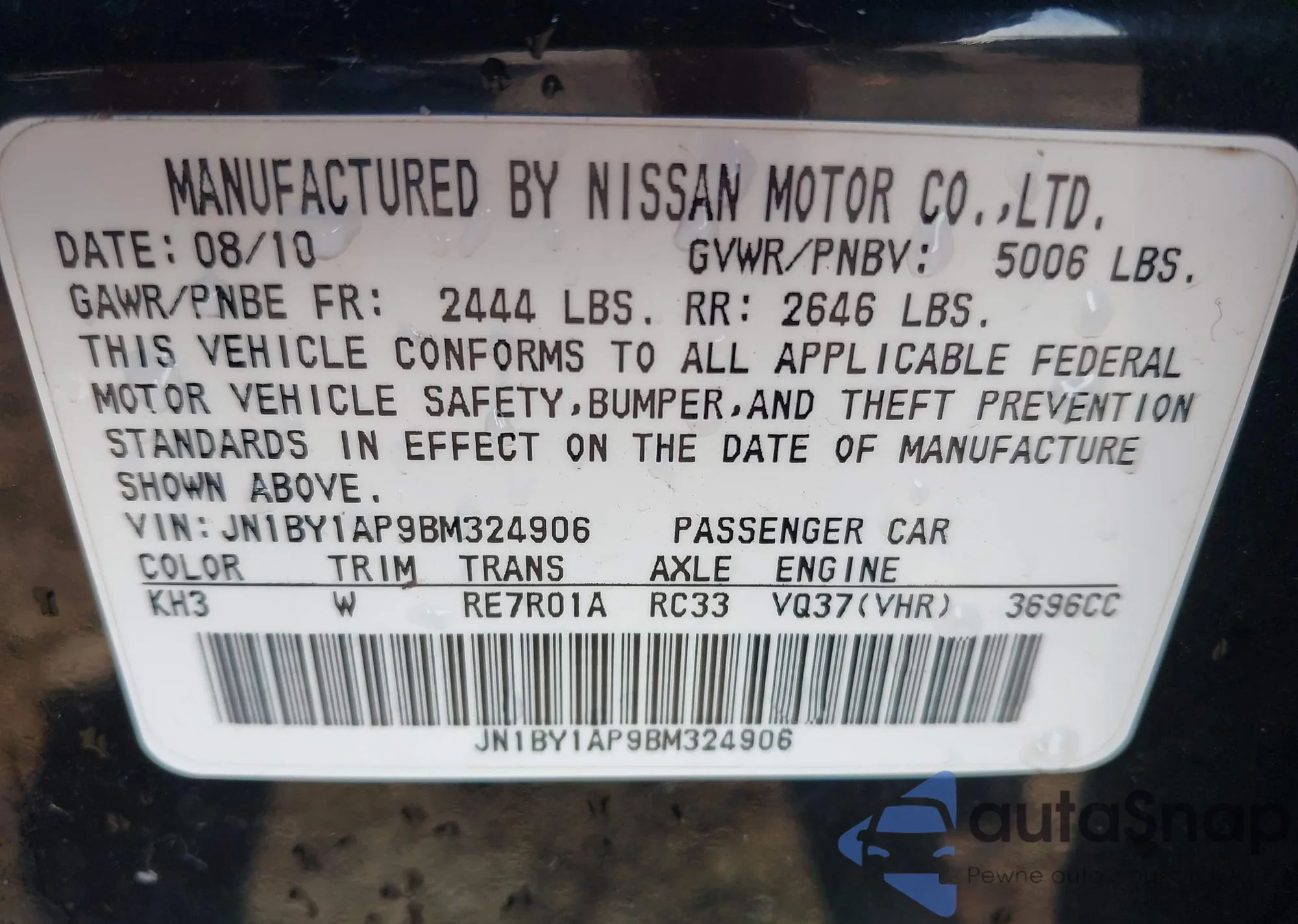 The car Infiniti M 2011 (VIN JN1BY1AP9BM324906) has documents that prevent registration. Export and registration may be difficult. Contact AutaSnap experts to find alternatives.