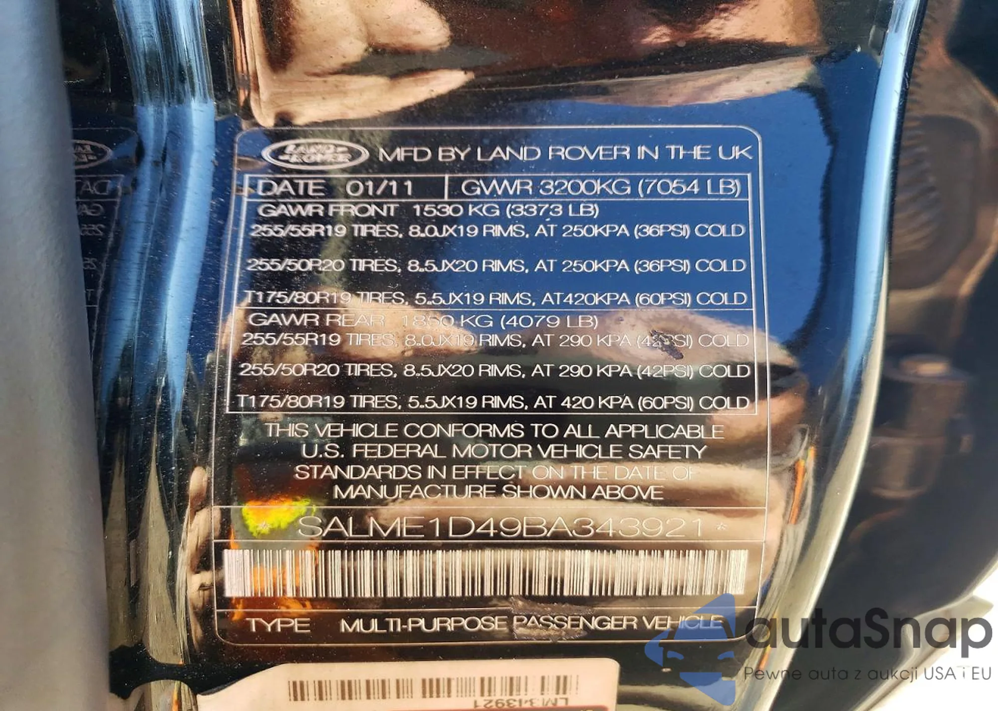 The car Land Rover Range Rover 2011 (VIN SALME1D49BA343921) is sold by an unverified seller. We recommend checking the Carfax report and confirming registration possibilities before purchase.