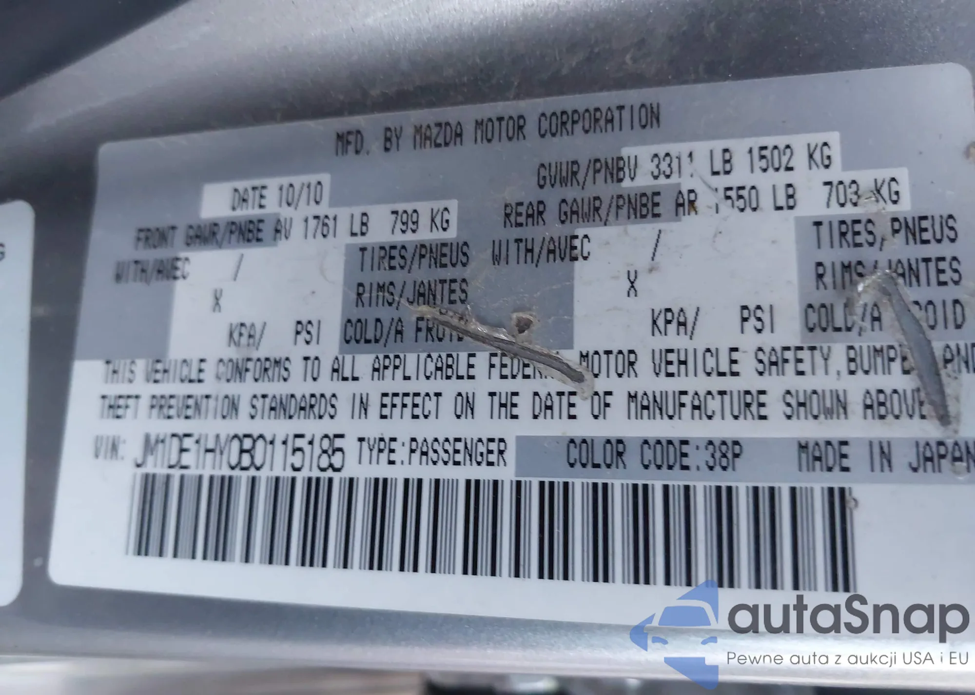 The car Mazda 2 2011 (VIN JM1DE1HY0B0115185) has documents that prevent registration. Export and registration may be difficult. Contact AutaSnap experts to find alternatives.
