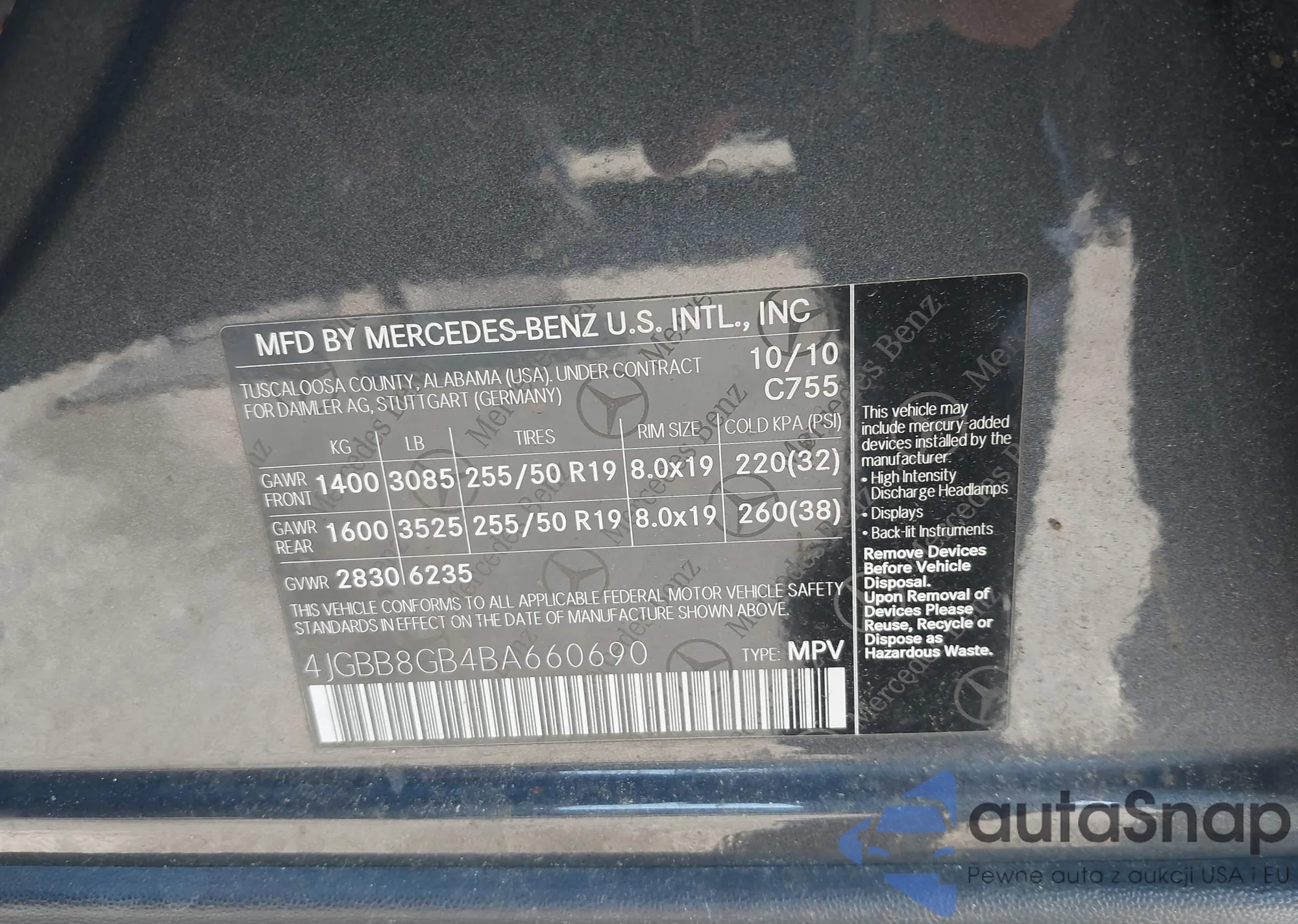 The car Mercedes-Benz M-klasse 2011 (VIN 4JGBB8GB4BA660690) has not been auctioned before. The documents are clean, and the mileage matches or is below the market average. Sold by an insurance company – we recommend purchase. Delivery to the port will take approx. 6–8 weeks.