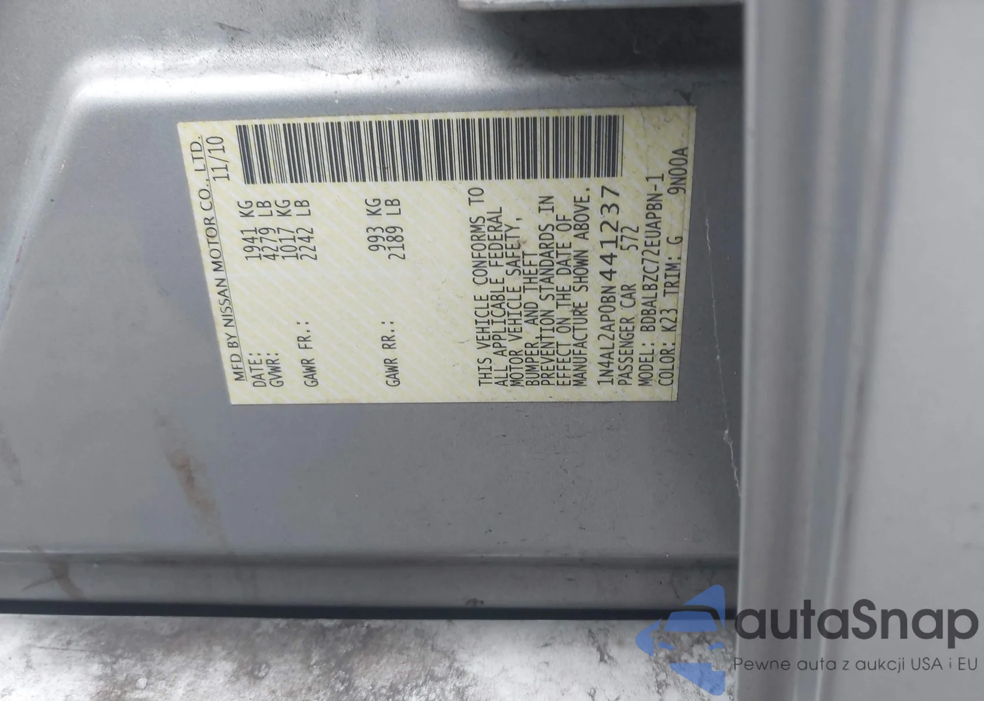 The car Nissan Altima 2011 (VIN 1N4AL2AP0BN441237) has not been auctioned before. The documents are clean, and the mileage matches or is below the market average. Sold by an insurance company – we recommend purchase. Delivery to the port will take approx. 6–8 weeks.