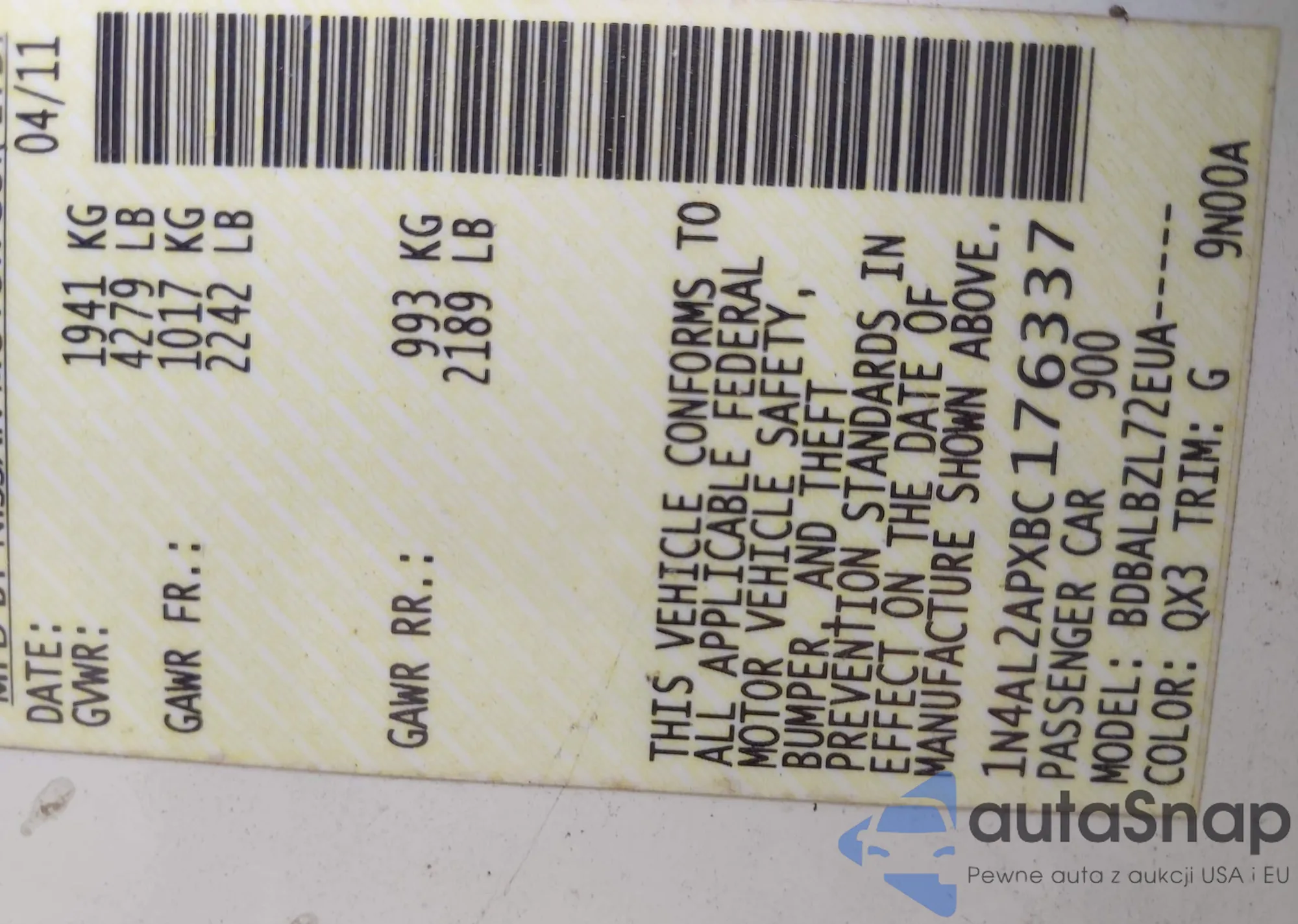 VIN: 1N4AL2APXBC176337