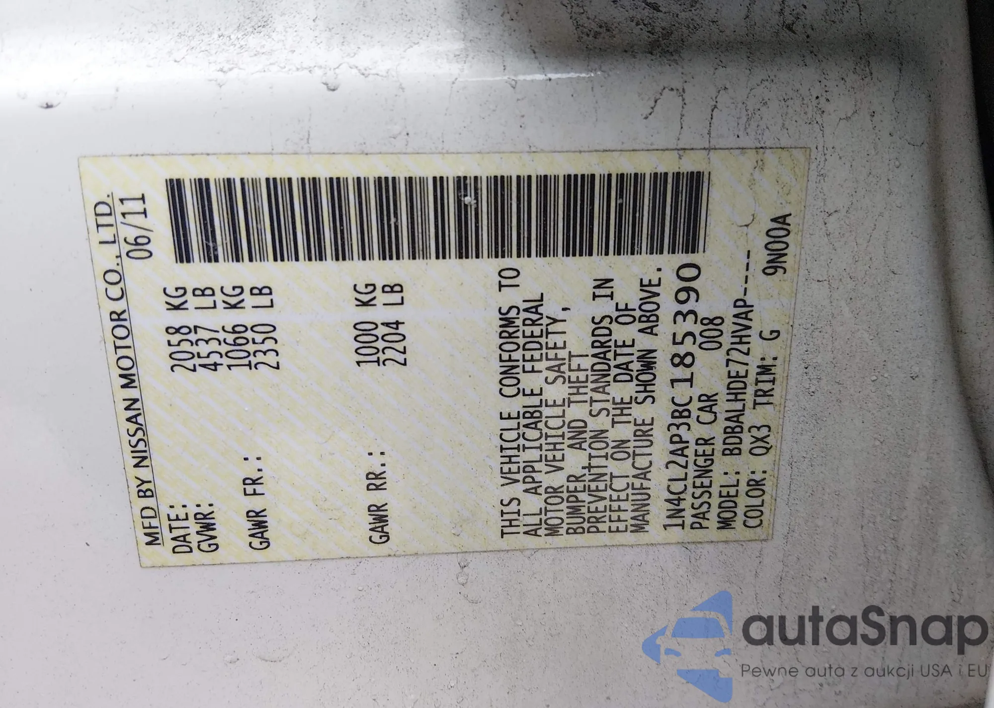 The car Nissan Altima 2011 (VIN 1N4CL2AP3BC185390) has not been auctioned before. The documents are clean, and the mileage matches or is below the market average. Sold by an insurance company – we recommend purchase. Delivery to the port will take approx. 6–8 weeks.