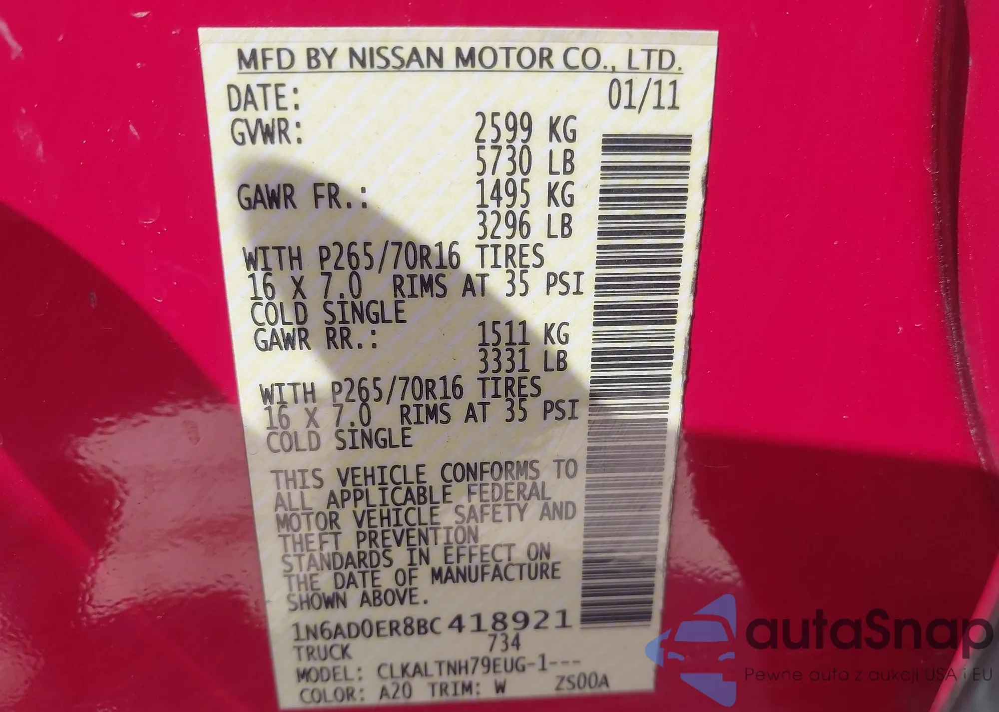 The car Nissan Navara (Frontier) 2011 (VIN 1N6AD0ER8BC418921) has not been auctioned before. The documents are clean, and the mileage matches or is below the market average. Sold by an insurance company – we recommend purchase. Delivery to the port will take approx. 6–8 weeks.